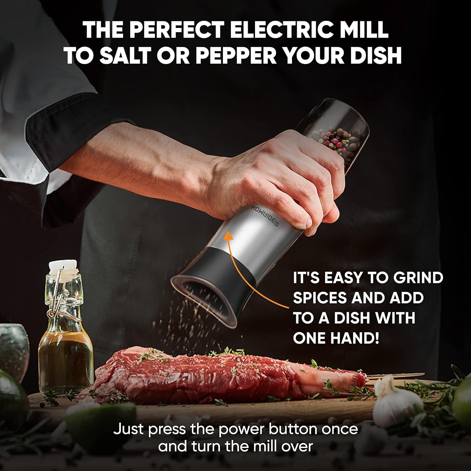 🎁 Designed to be gifted: Stylishly performed, brushed stainless steel body of the automatic salt and pepper grinder set will fit in with a variety of kitchen interiors. Comes in a gift box!