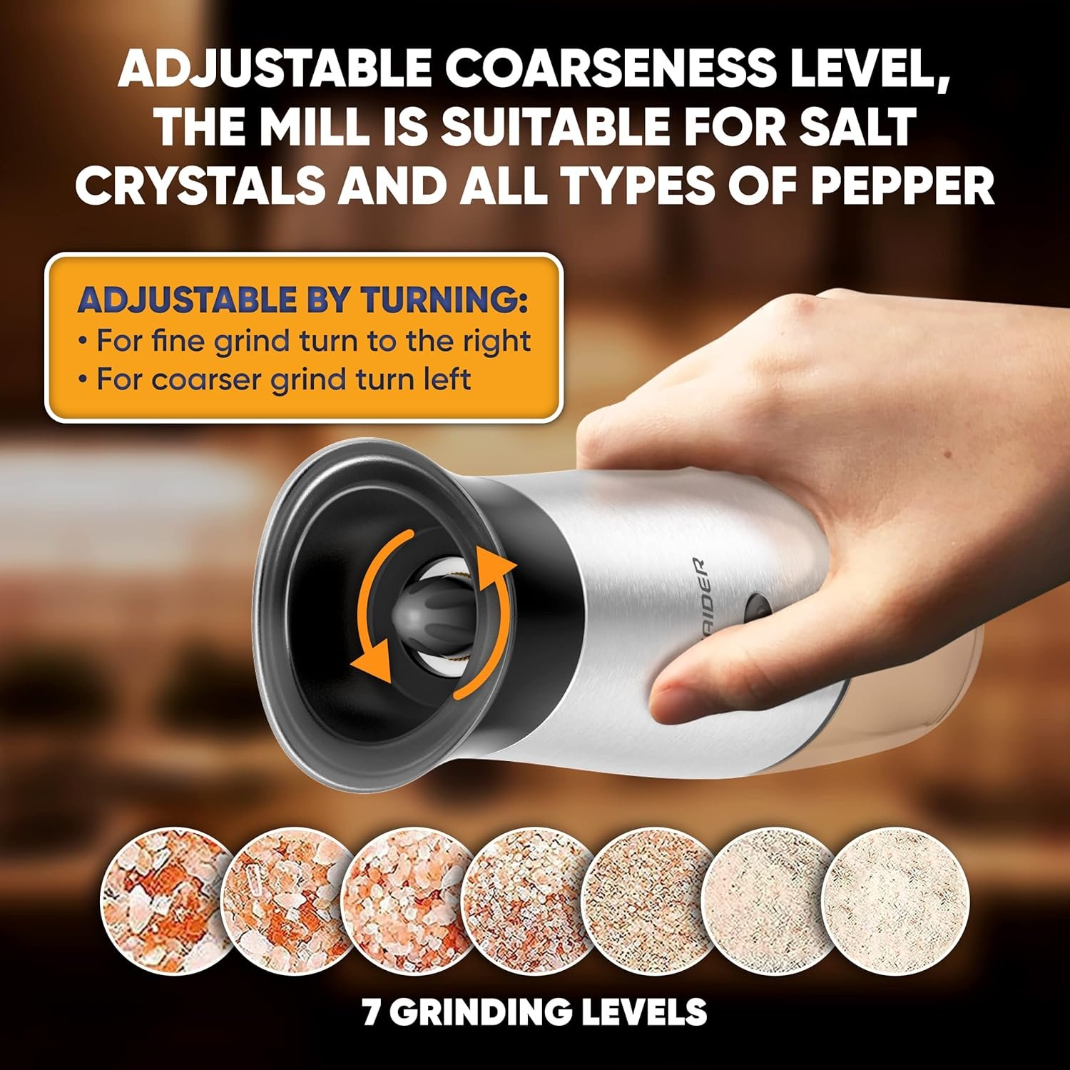 👍 7 Levels of adjustable coarseness: Adjust the density of your seasoning (pepper, salt, cumin, mustard and more) by twisting the ceramic coarseness knob. A total of 7 grinding levels will allow you to adjust the electric salt and pepper grinders to your desired preset.