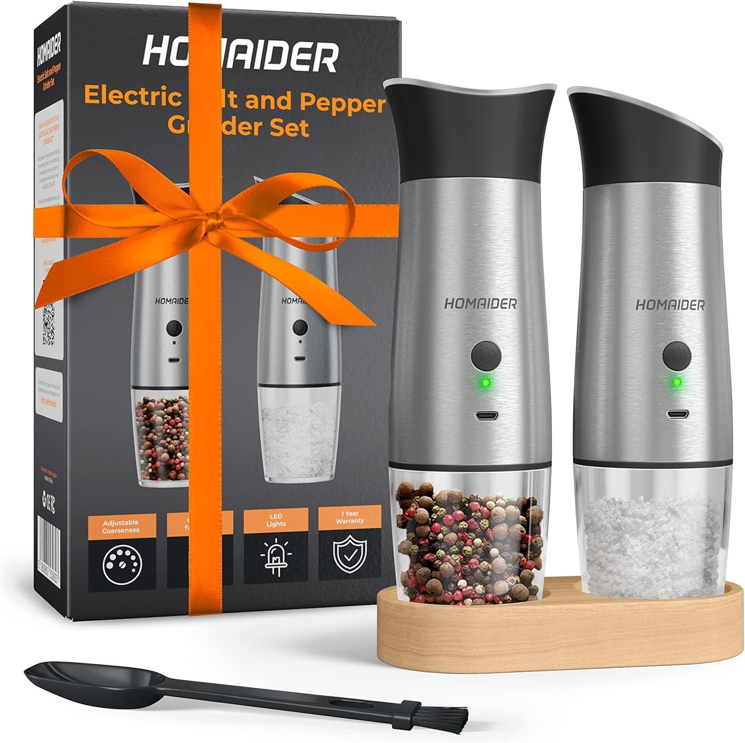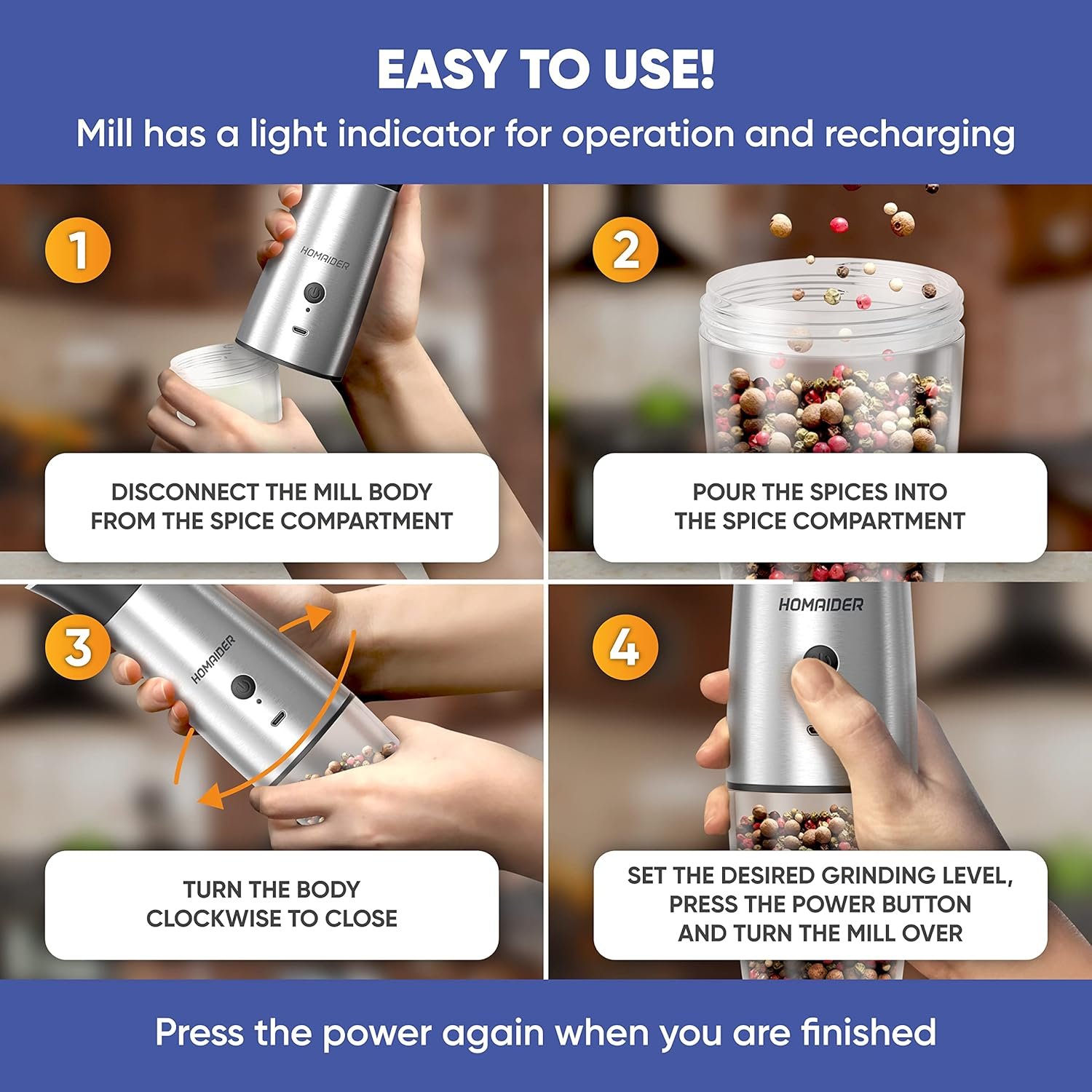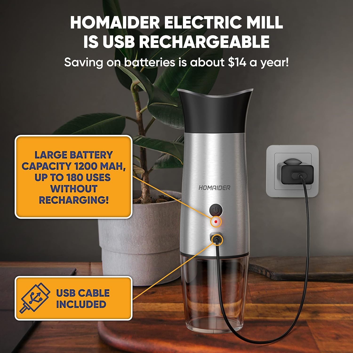 đŸĒĢ Forget About Batteries: The Homaider rechargeable salt and pepper grinder – a totally hassle free gadget. The grinder is powered by a 1200 mAh battery which can work without a re-charge for up to 180 activations. Avoid the necessity of spending your time and money for replacement batteries. Two charging cables included.