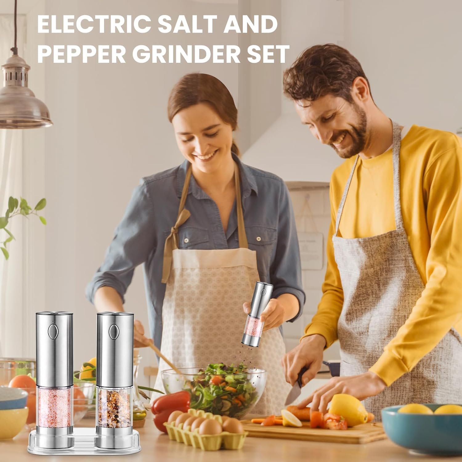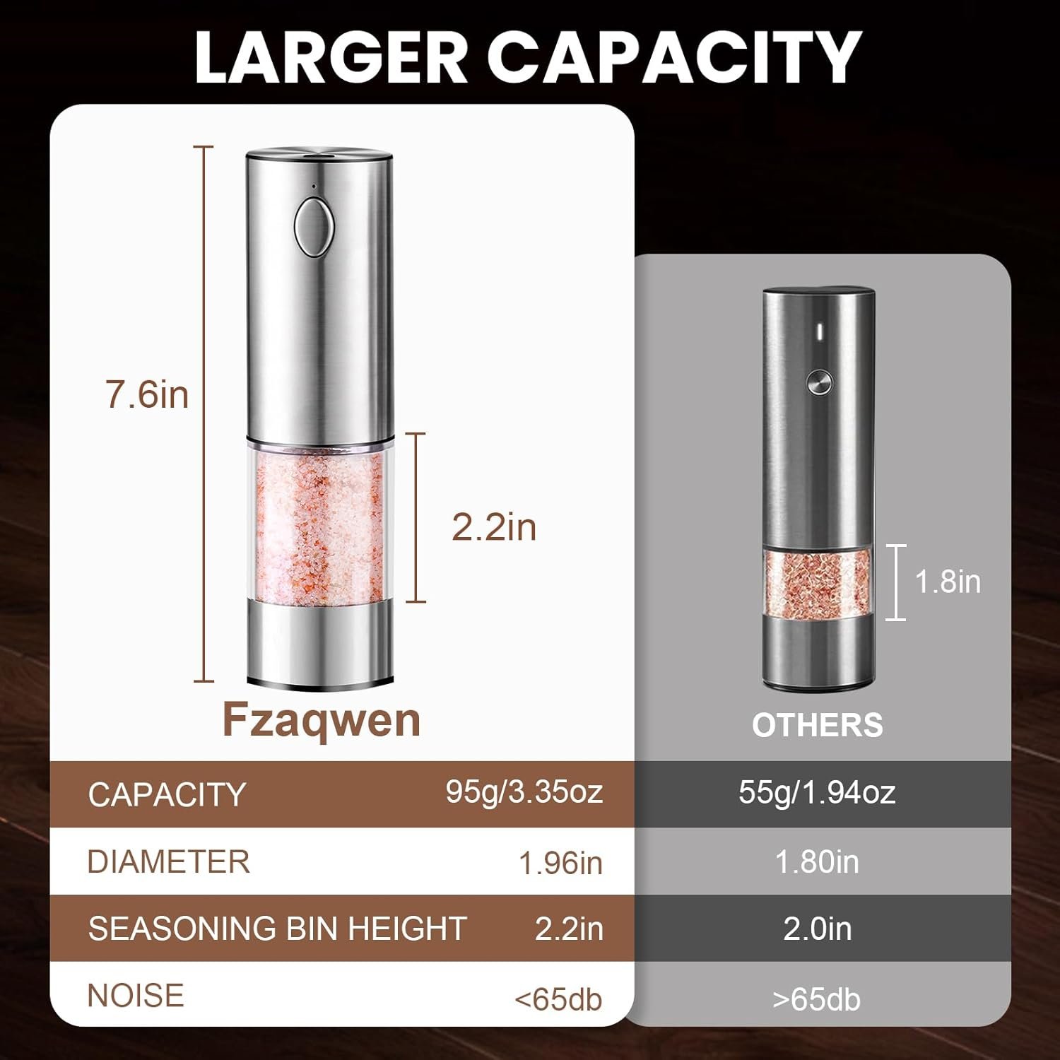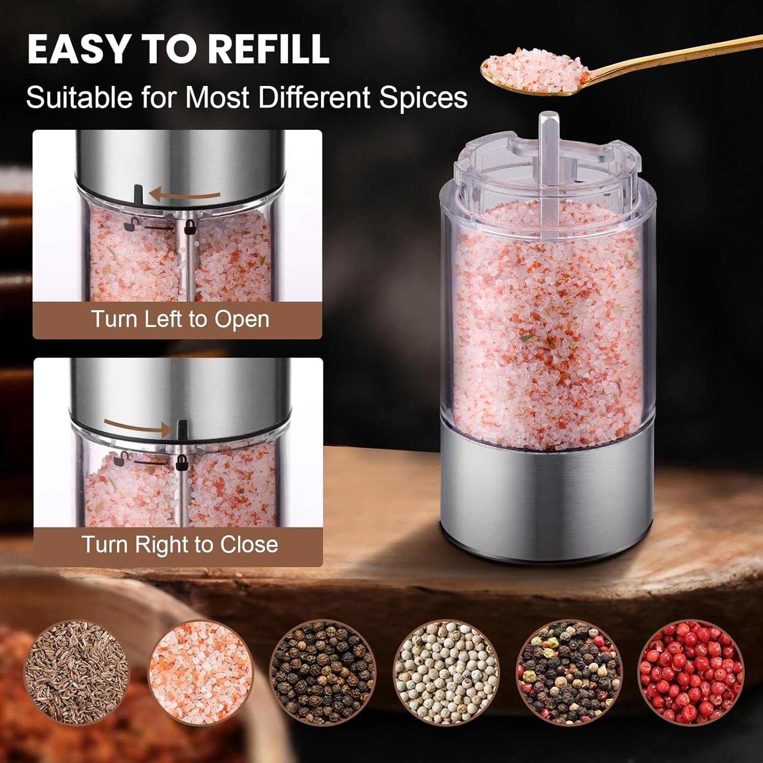 【WIDELY APPLICABLE】The power salt and pepper grinder set is suitable for most solid spices, such as sea salt, black pepper, white pepper, cumin seeds and other spices. The transparent plastic spice bin makes it easy to view the remaining spices and distinguish different seasonings. It is a good helper for restaurants, parties, picnics and barbecues