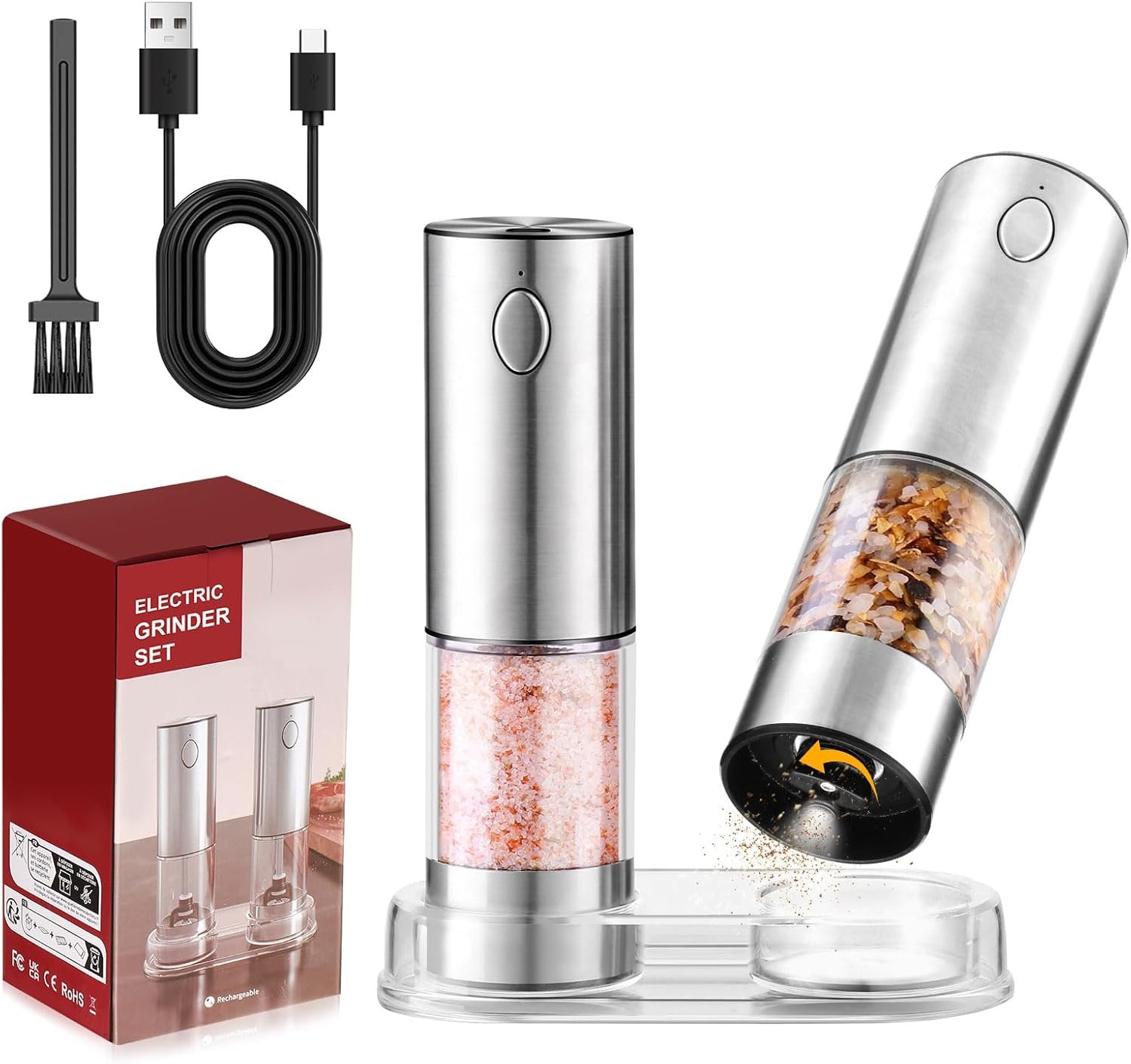 【STORAGE BASE DESIGN】The auto salt and pepper grinder set rechargeable is equipped with a transparent plastic storage base withnot spices falling on the table