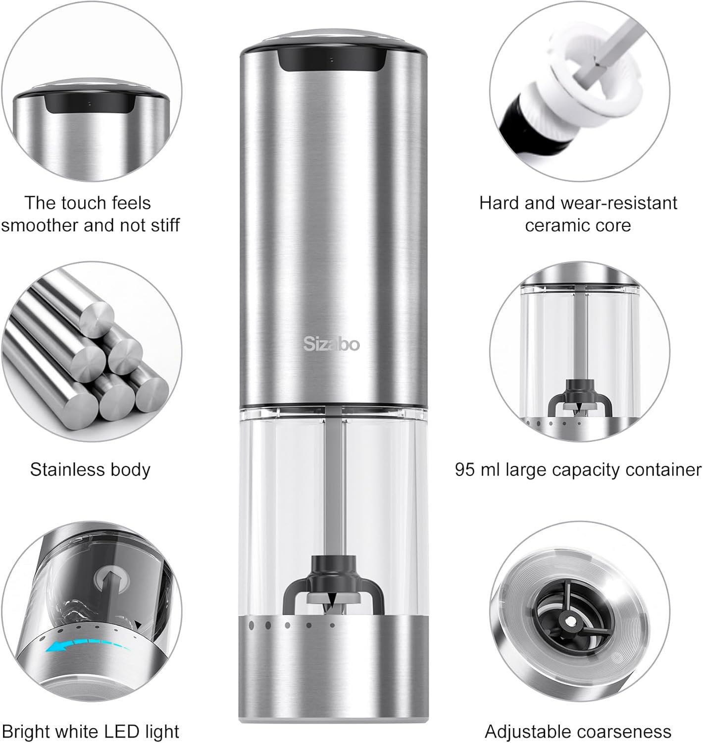 Sizabo electric salt and pepper grinder is designed for one-handed operation, making it easier and more convenient to use. All you need to do is adjust the coarseness of the grind in advance with the outer ring knob, no need to set it before each use, just press the button to enjoy a precise and even grinding experience. Whether in the kitchen or at the table, it adds convenience and efficiency to your cooking and enhances the overall dining experience.