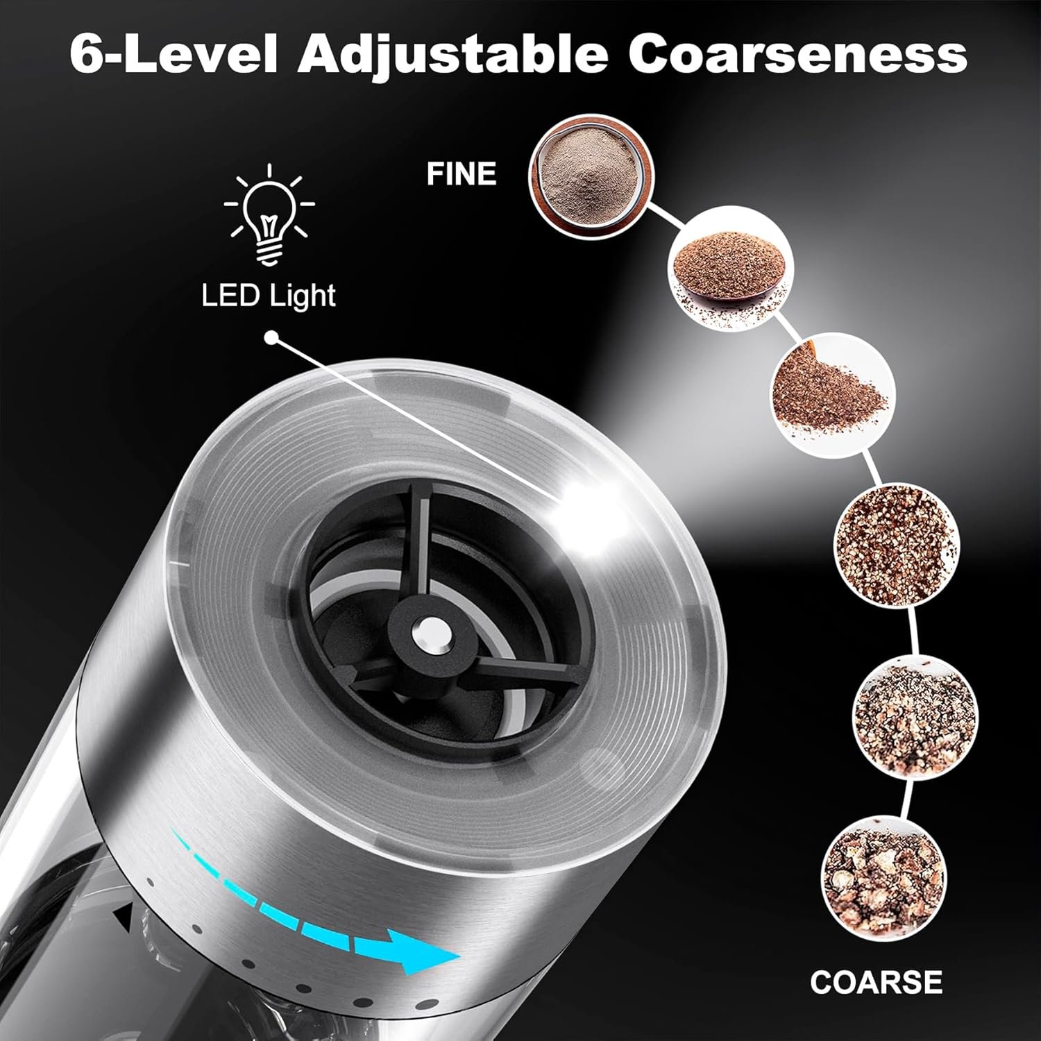CONVENIENT ONE-HANDED OPERATION: The premium electric salt and pepper grinder is battery operated with a flexible one-handed operation design, allowing you to season your food when pressing the button. It is also convenient to carry the grinder on its own when fully charged for camping and picnics