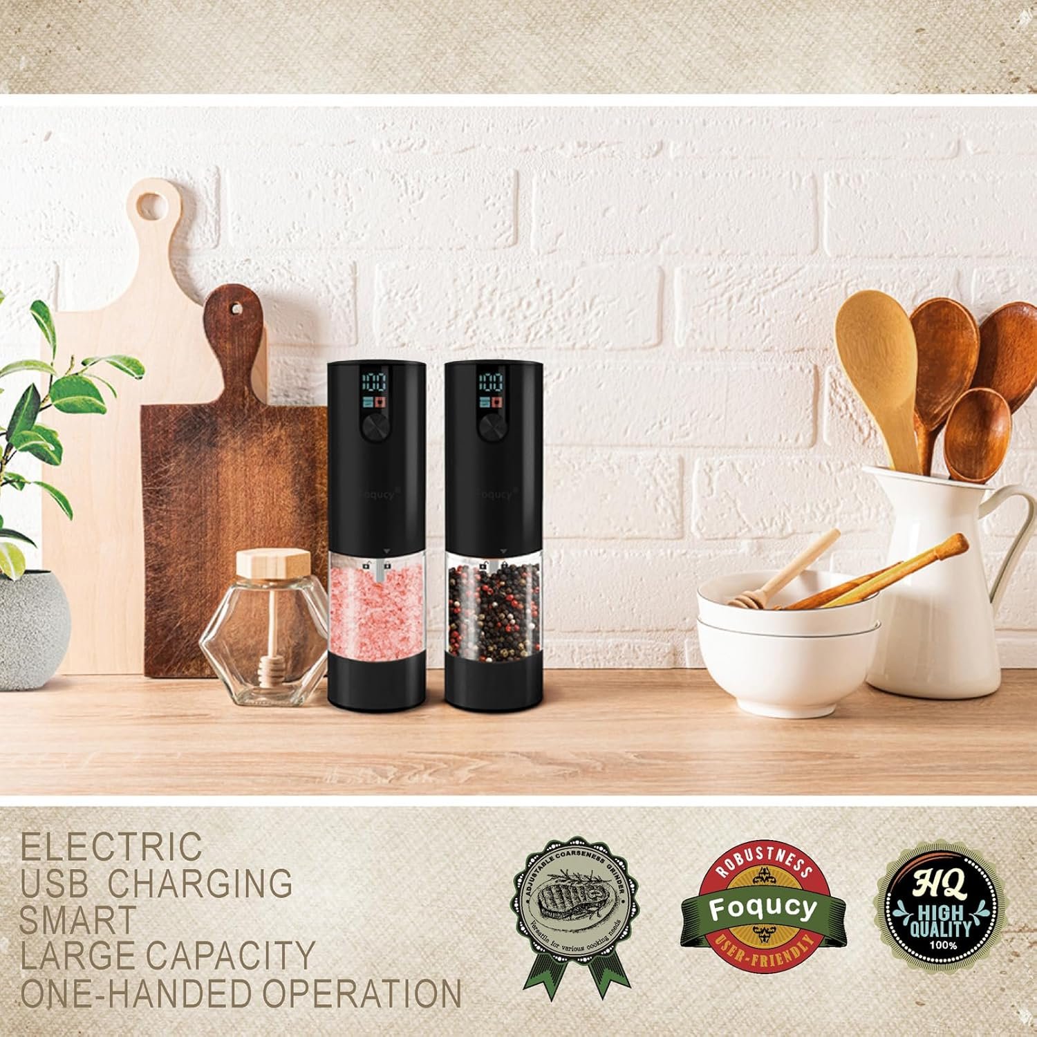 UNIQUE DESIGN – Our pepper and salt grinder set features the latest battery level monitoring design. The digital display detects the remaining battery capacity in real-time, informing you of the battery level after each use. This ensures that you won’t be unable to use it when the battery is low next time.