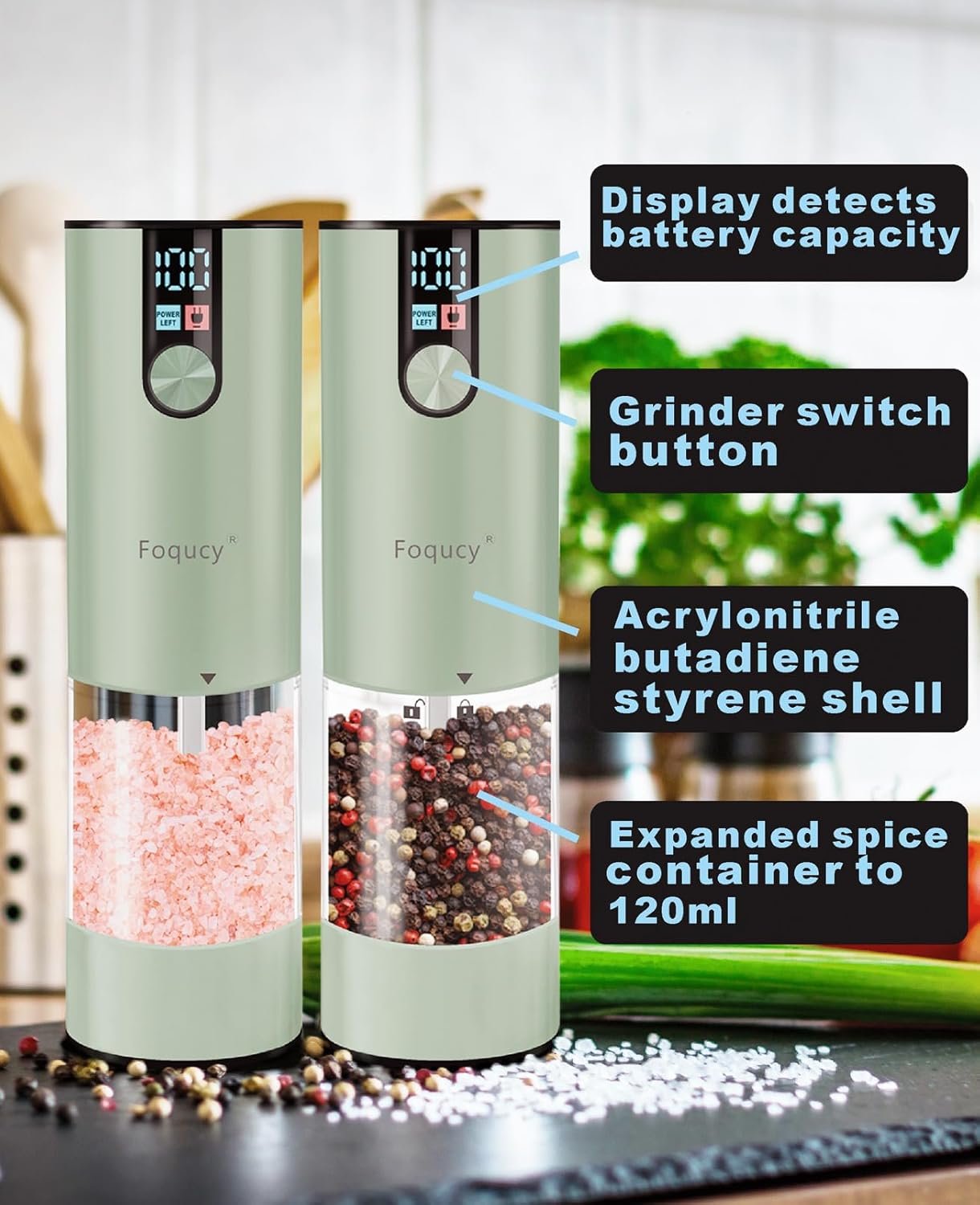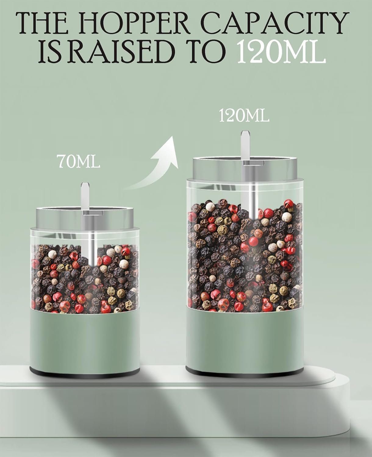 UPGRADED CAPACITY – The spice compartment of the pepper and salt grinder set has been enlarged to 120ml. This means you won’t need to add spices frequently while cooking.