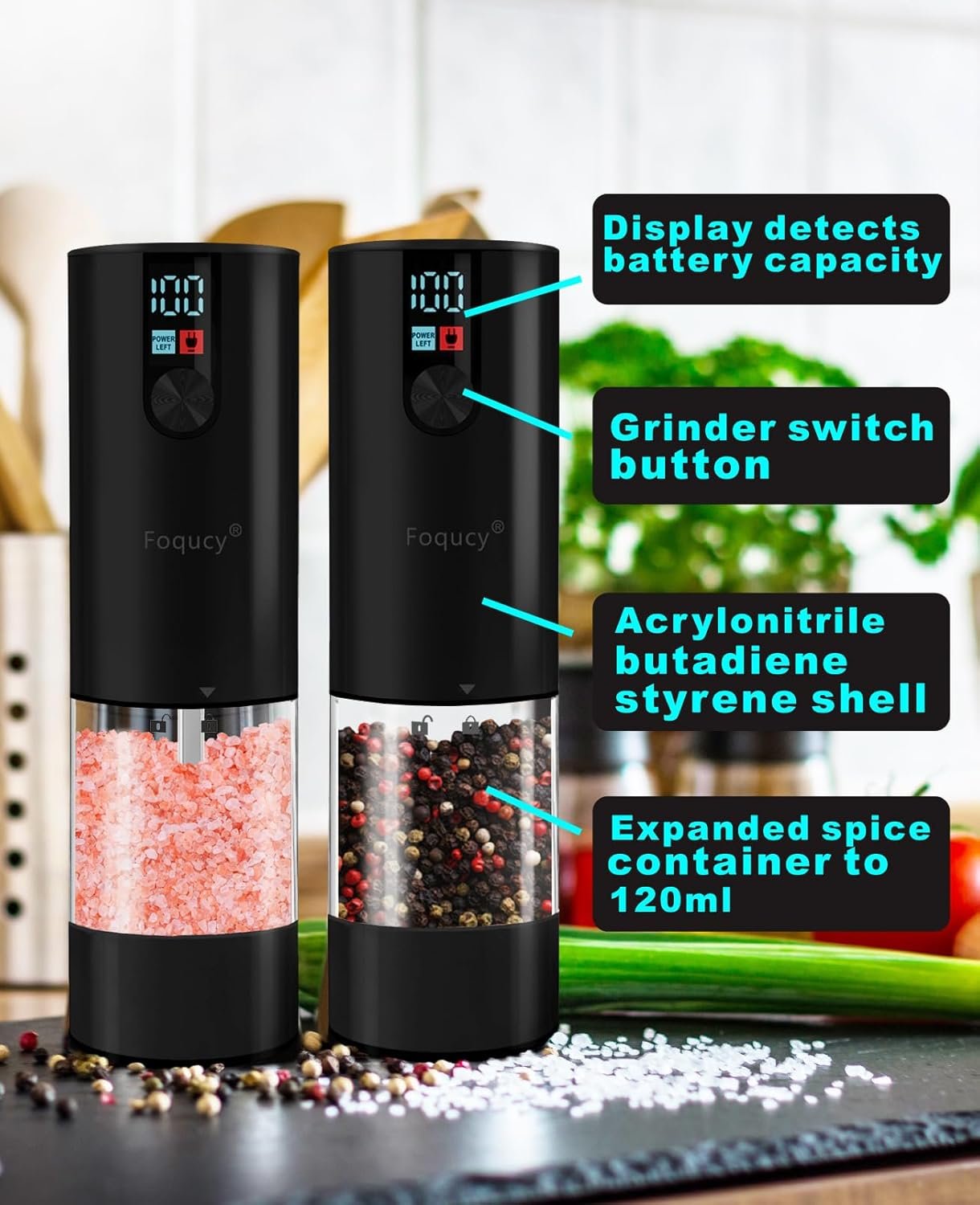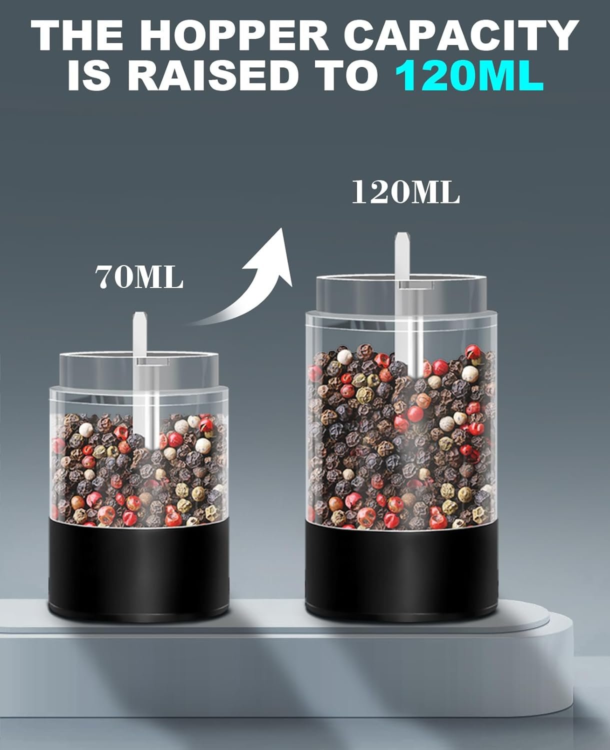 UPGRADED CAPACITY – The spice compartment of the pepper and salt grinder set has been enlarged to 120ml. This means you won’t need to add spices frequently while cooking.