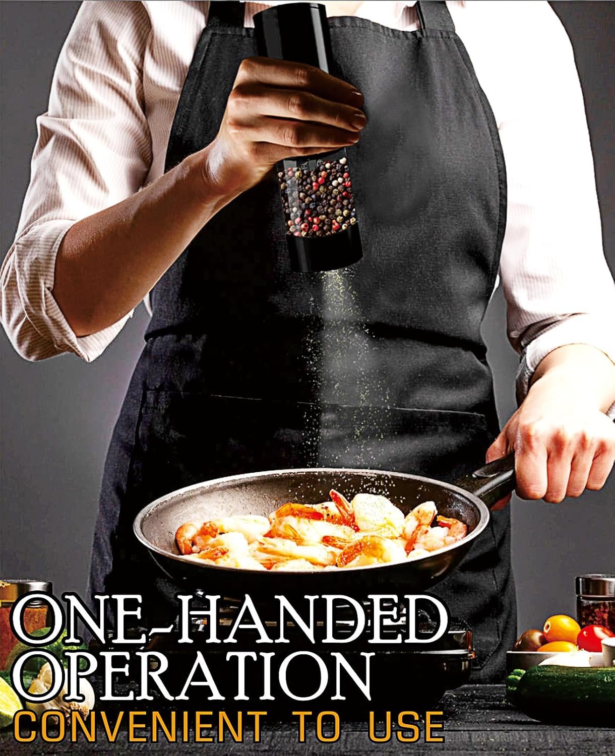 ADJUSTABLE COARSENESS AND ONE-HANDED OPERATION – By turning a button on the bottom, the pepper grinder can adjust the coarseness or fineness to suit different types of food and textures. It can also be operated with one hand, making it easy and convenient to use.
