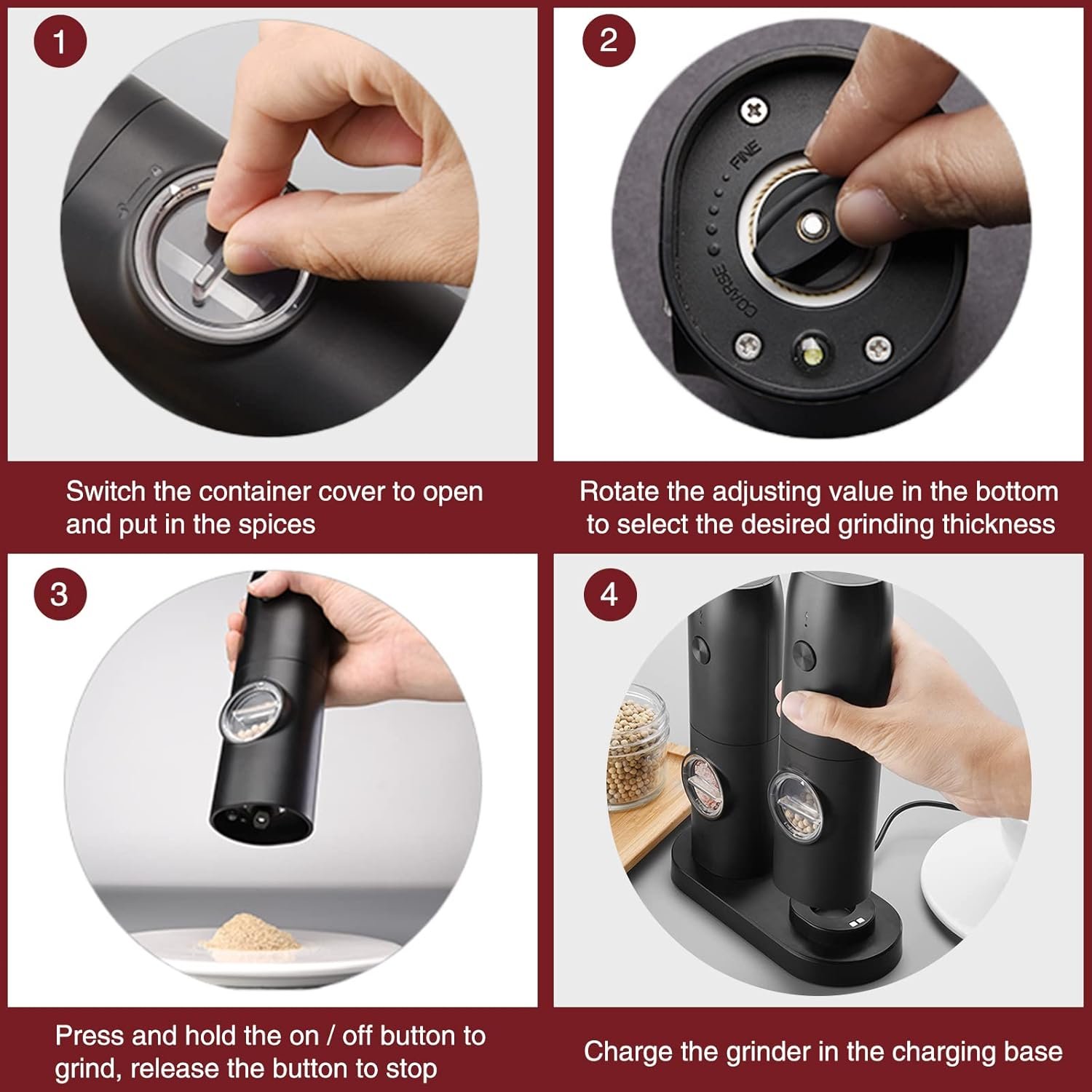 【Upgraded Design】TEITOP Electric salt and pepper grinder set easy to use, press the button you can get fine salt and pepper you want. Built-in rechargeable lithium battery, so no additional battery is required. When pepper and salt grinder requires charging, you can just put it on the charging base. The grinder can be placed on the base all the time, and will automatically power off after being fully charged, without worrying about overcharging