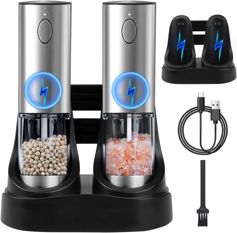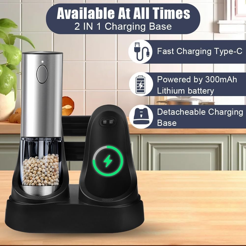 【Unique Rechargeable & Detachable Base Design for Convenience】The electric salt and pepper shakers can be conveniently charged via a Type-C cable. The base is detachable for easy cleaning of any residual spices. Electric pepper grinder features a recessed groove on the back of the base, making it easy to carry.