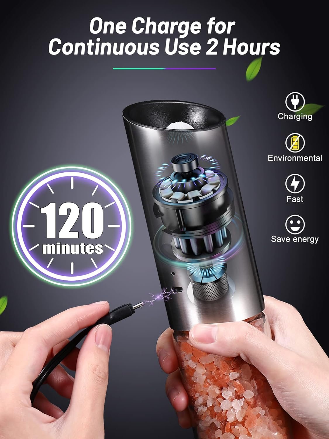 【USB Rechargeable & Kitchen Must Haves 】Our upgraded rechargeable salt and pepper grinder set avoids the hassle of battery replacement, which is different from other automatic salt and pepper grinder set. The electric pepper grinder has a built-in rechargeable 1200mah lithium battery, allowing you to charge it anytime, anywhere. The super long standby time supports 180 uses on a single charge.