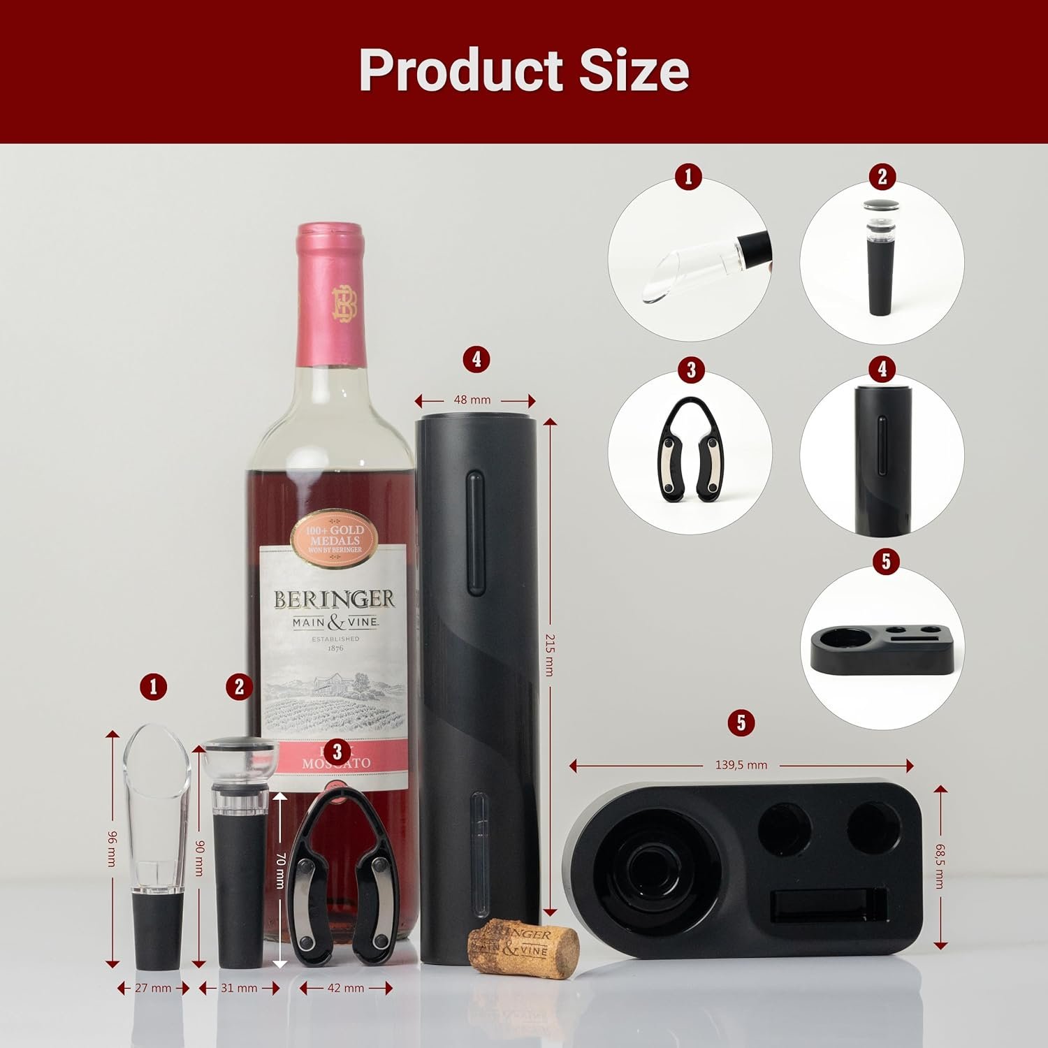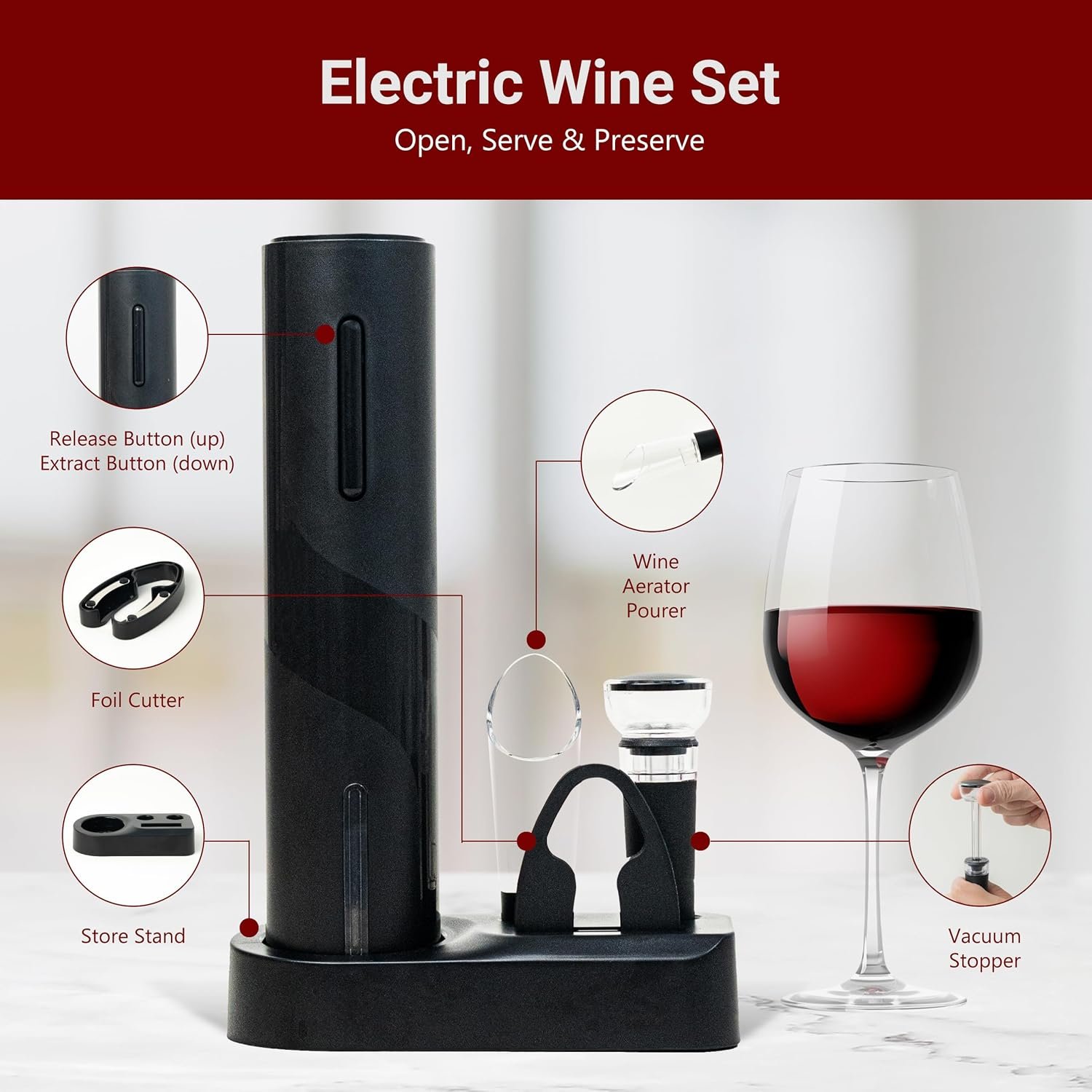 [Electric Vacuum Preserver]: Unlike manual vacuum pumps, the electric vacuum preserver in this wine set saves you time and effort. Made from food-grade materials, the vacuum stopper keeps wine fresh for up to a week by removing air from the bottle, preserving its original flavor.