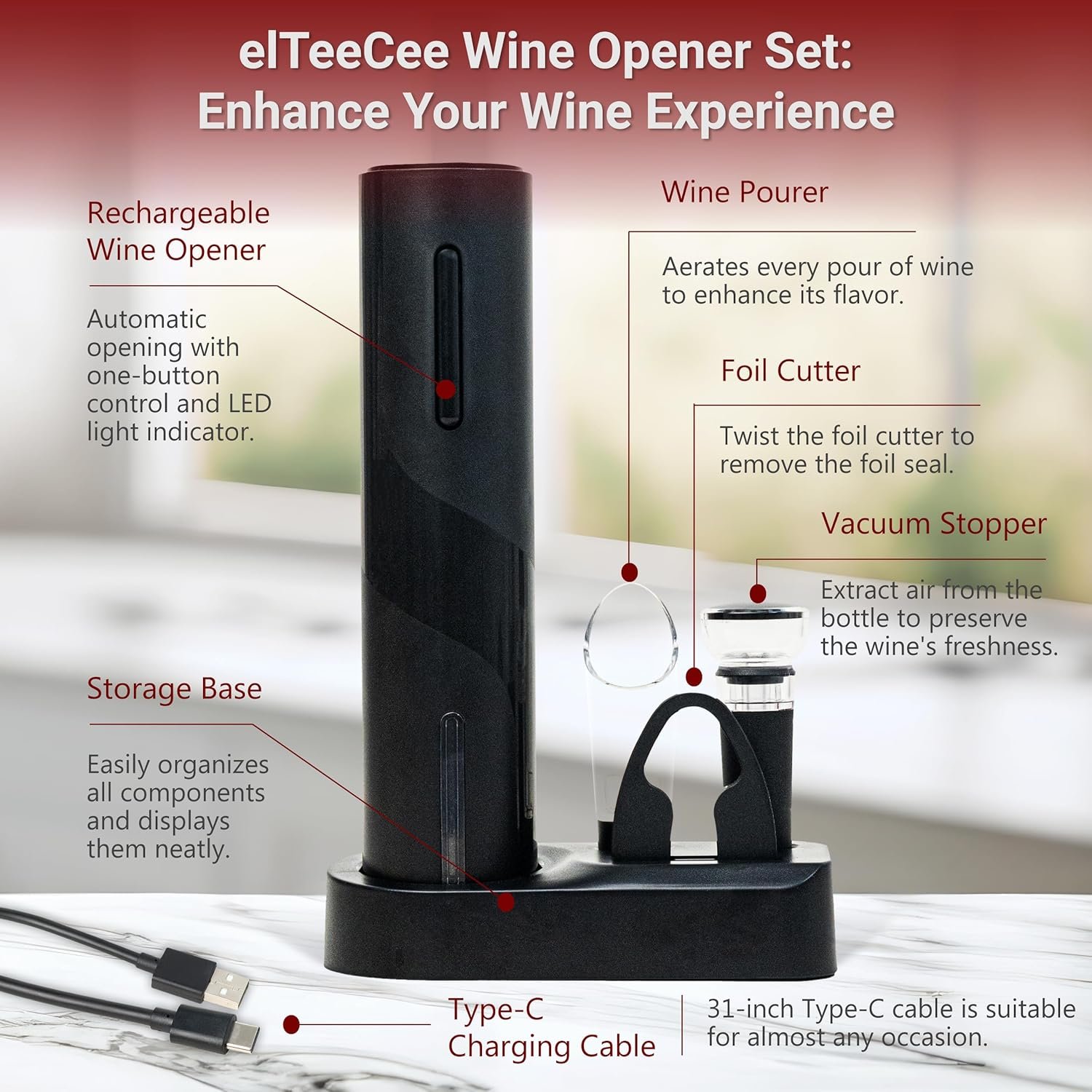 Make wine tasting easier and more enjoyable with the elTeeCee electric wine bottle opener. Perfect for yourself or as a gift for any wine lover, this set brings convenience, elegance, and a touch of luxury to your wine routine.