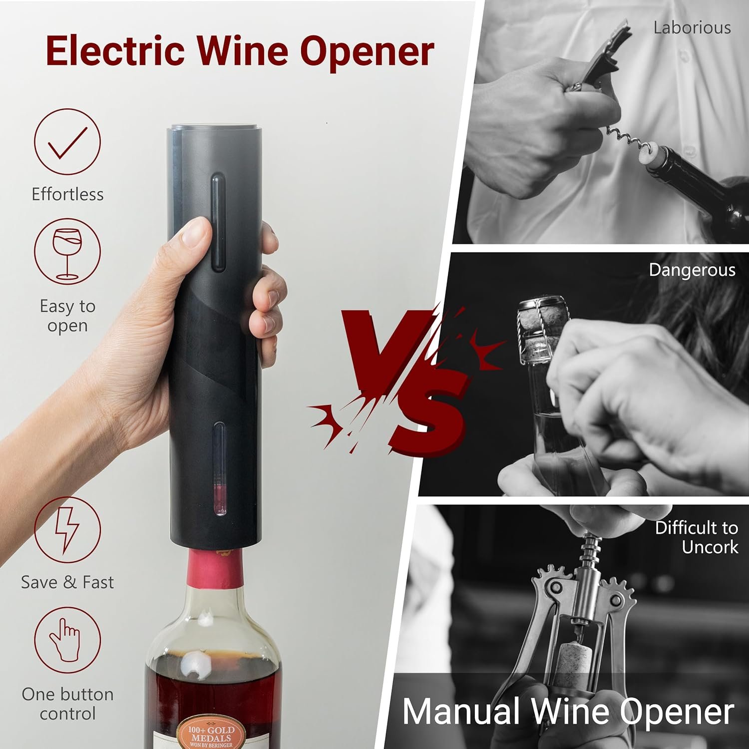 [Effortless Wine Uncorking]: With the automatic bottle opener and included foil cutter, you can effortlessly open wine bottles in seconds at the push of a button. Say goodbye to the hassle of traditional corkscrews. The stainless steel corkscrew ensures long-lasting performance and durability.