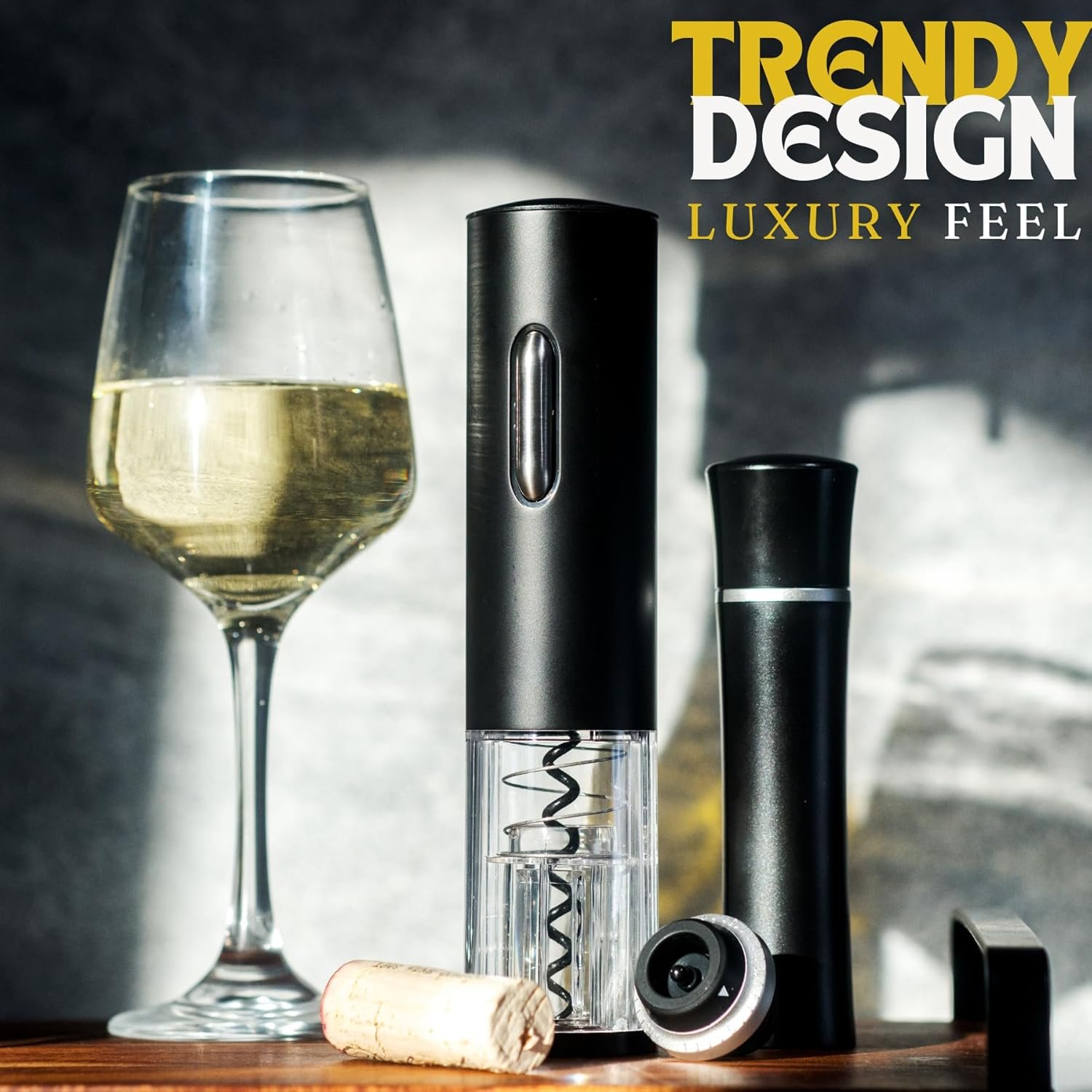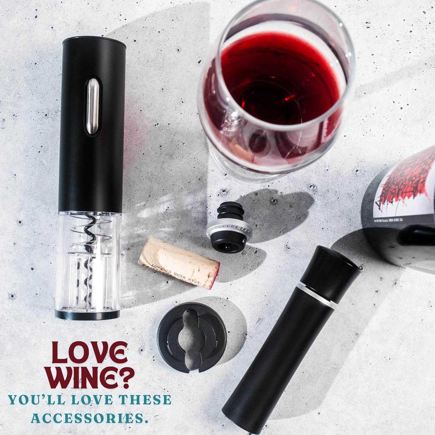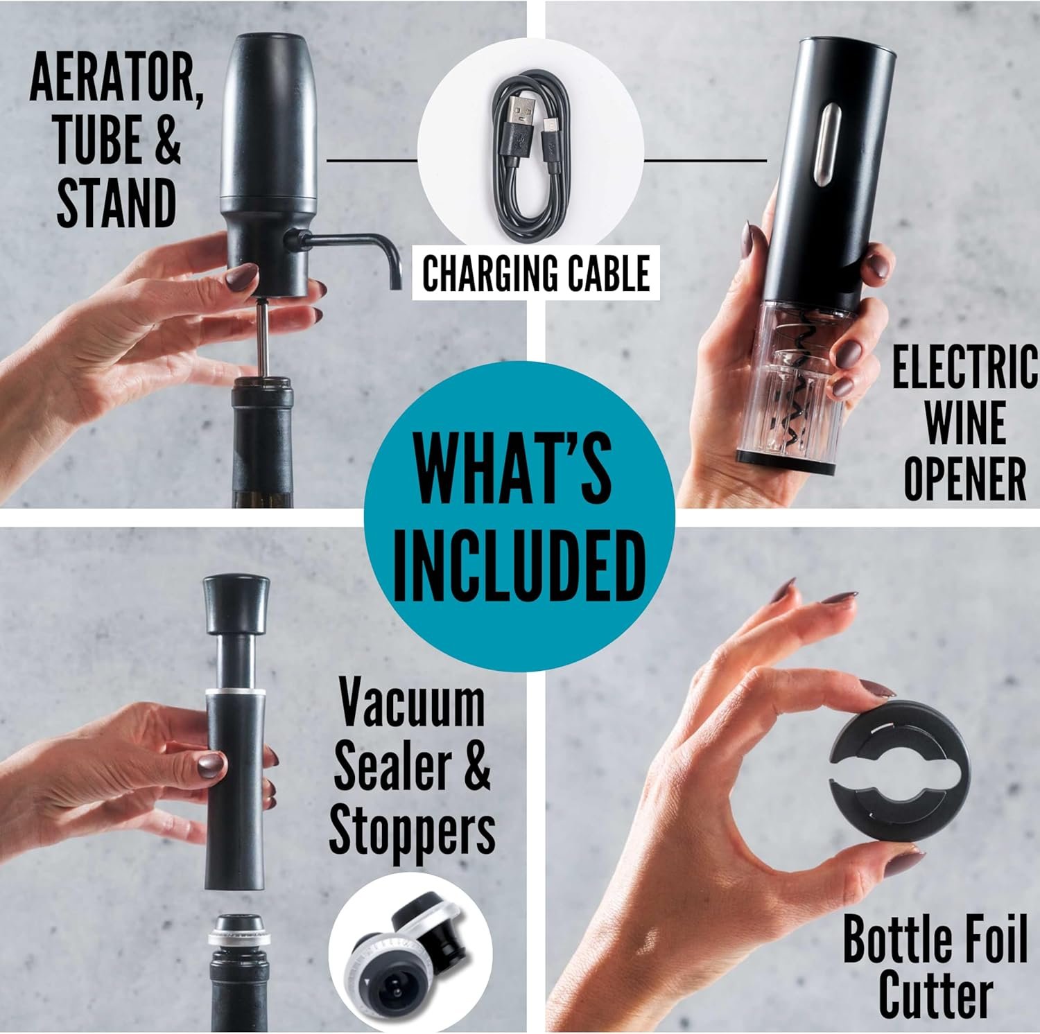 ALL-IN-ONE WINE SET GIFT: Our electric wine corkscrew set with complete wine accessories has everything you need from effortlessly opening the bottle to preserving any leftover wine. Our foil cutter, electric corkscrew wine opener, wine air aerator and vacuum sealer with stoppers makes every step simple. 5-in-1 electric wine bottle opener set has custom packaging designed with gift giving in mind for Mother’s Day gift, Father’s Day gifts, gifts for wine lovers.