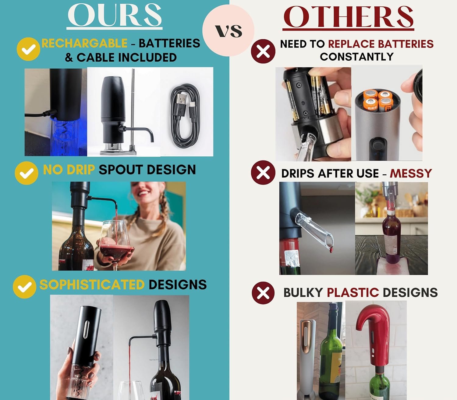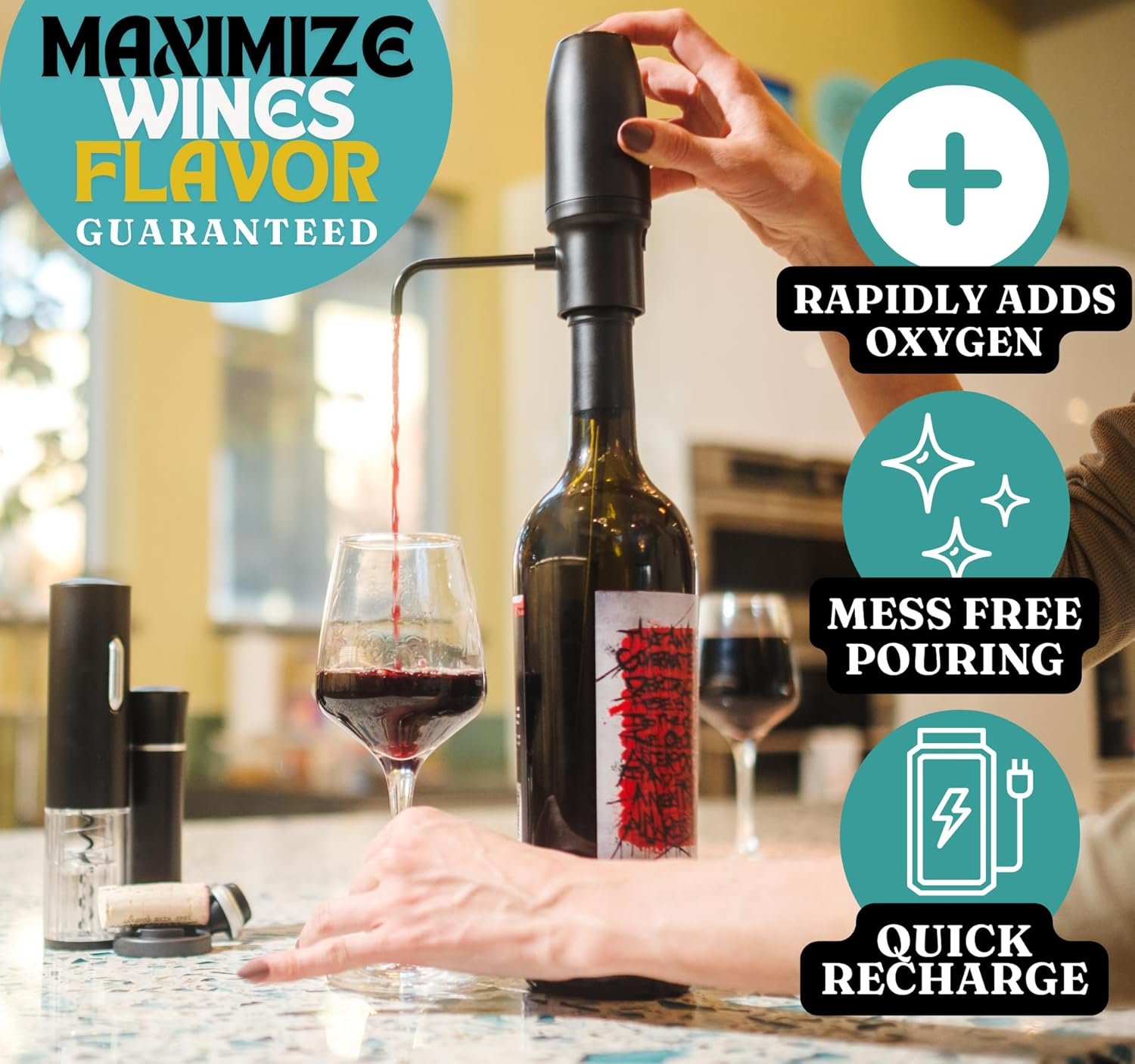 NO BATTERIES NEEDED: No need to worry about batteries, we have rechargeable ones built-in! Charging cable included and battteries in our wine opener electric rechargeable & wine dispensers, ensuring a reliable and cordless operation. Making your downtime as relaxing as possible with our dispensador de vino and accessories set.