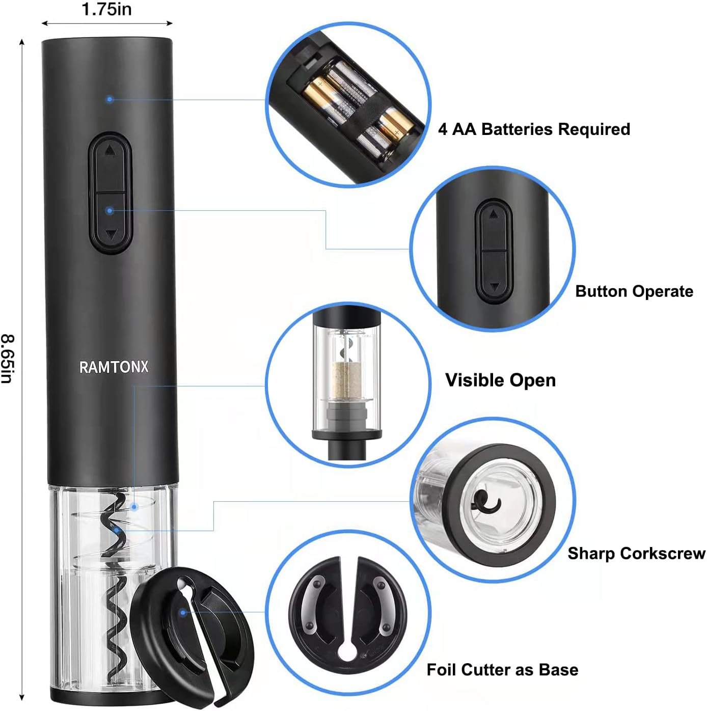 【Durable】: The electric wine bottle opener set is with a powerful and fast cork removal function that can open up to 100 wine bottles at one time. 4 batteries required (no batteries included).