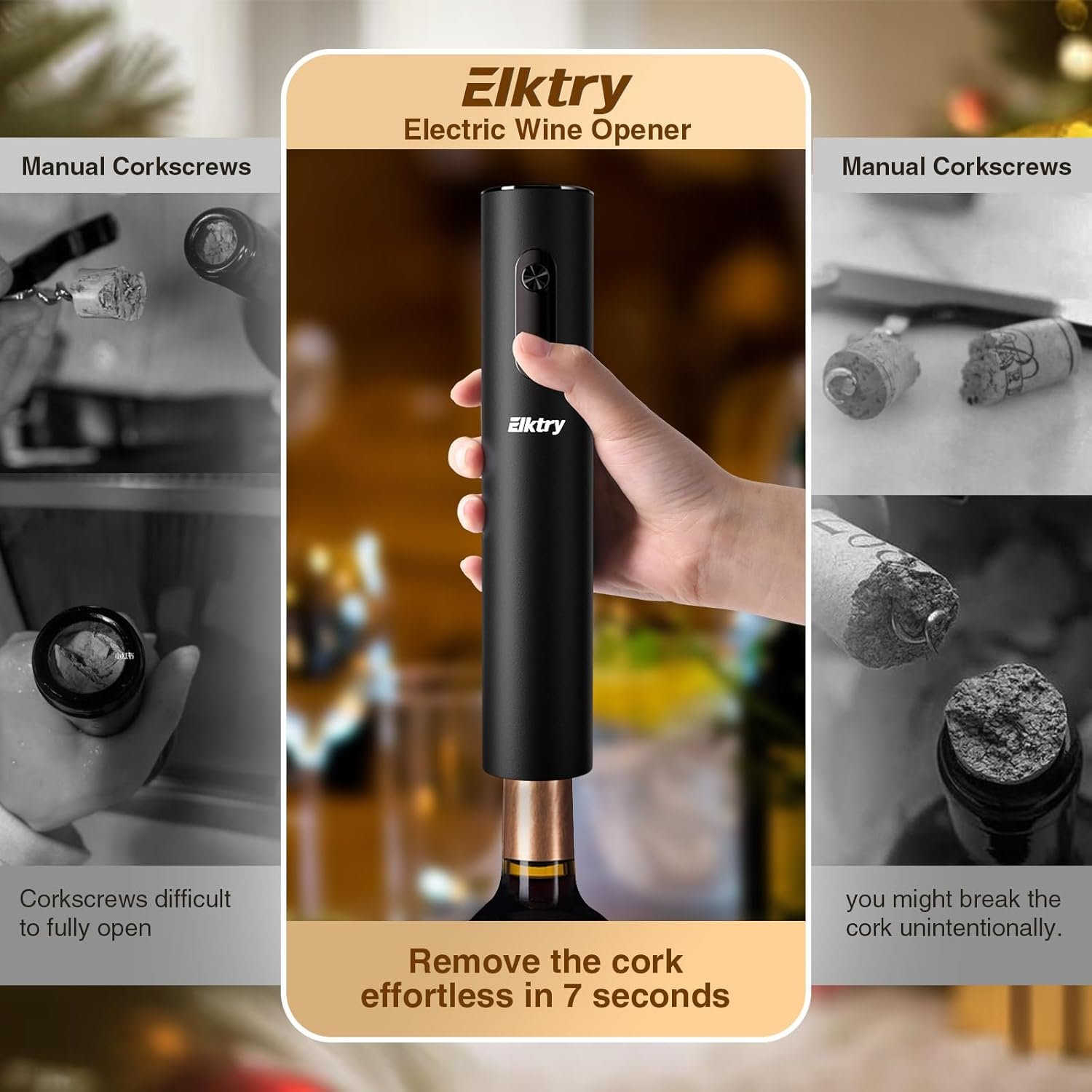 đ·ă7S One-touch OperationăLooking for a product that takes the hassle out of opening a bottle of wine? Within only 7 seconds, Elktry electric wine opener will do all the work for you! Just place it on the bottle, press the lower button to remove the cork, and then press the upper button to release the cork from the screw – no twisting or turning necessary. Definitely a must-have electric wine opener for wine lovers!