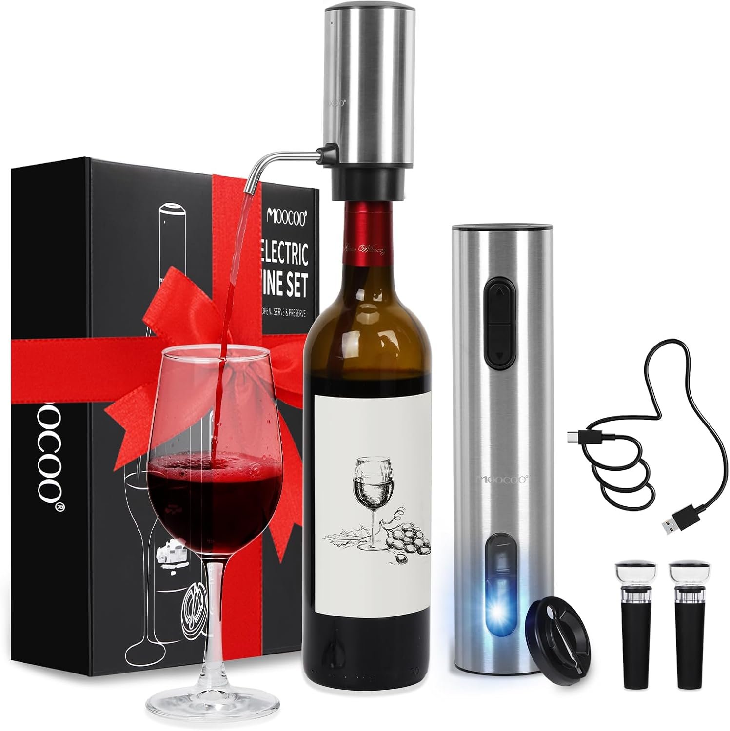 2024 upgraded Moocoo electric wine opener set contains amost all you need, gives you a fabulous wine drinking experience.
