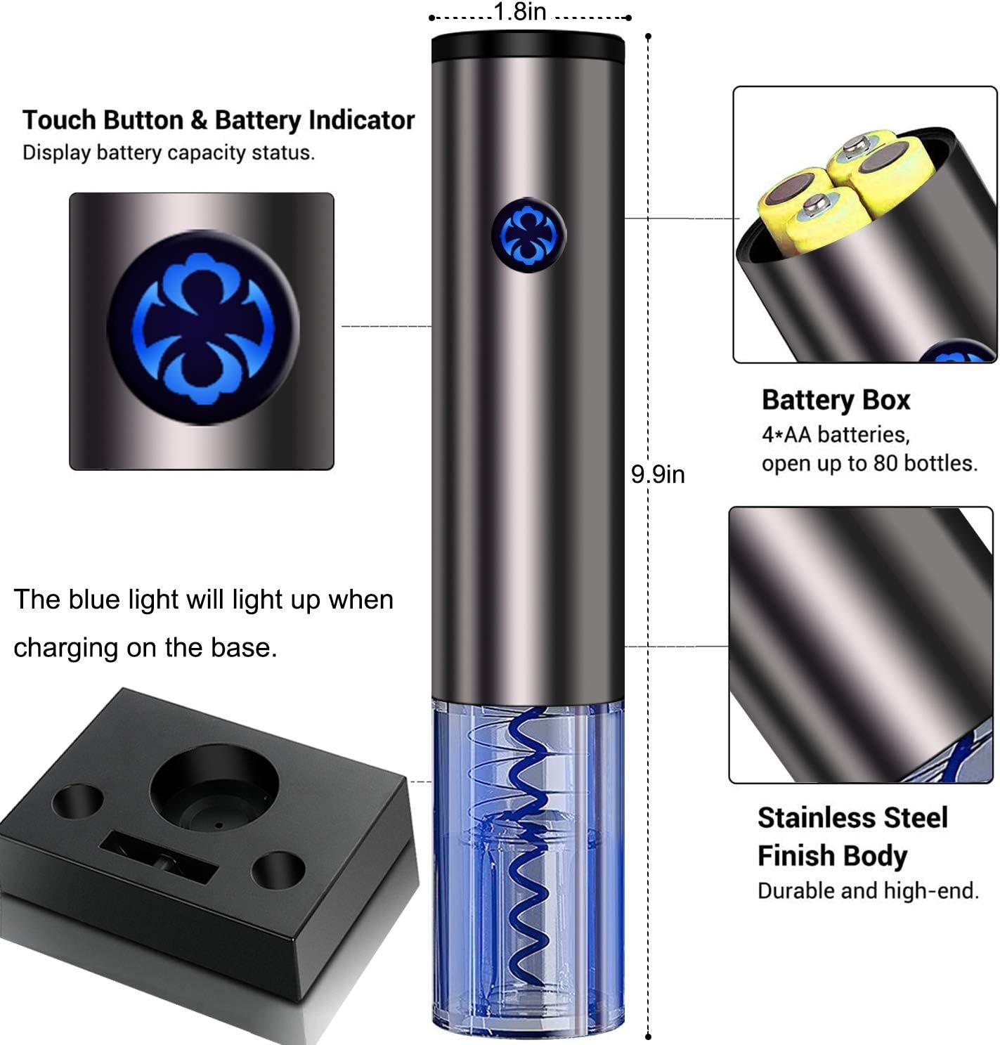 🍷【EASE TO USE】Stainless Steel Touch-Button Opener Captures & Removes Up to 60 Corks on a Full Charge with Simple Tilting the Bottle Opener to 45° will Automatically Remove the Cork. Features Convenient See-Through Window for Easy Viewing