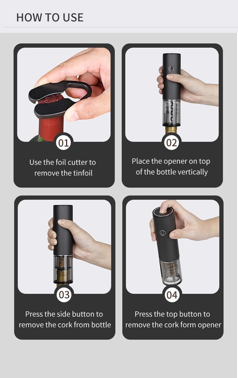 One-stop solutionFast open in secondsThe kit including battery powered electric wine opener,2pcs vacuum preserver,foil cutter,wine pourer