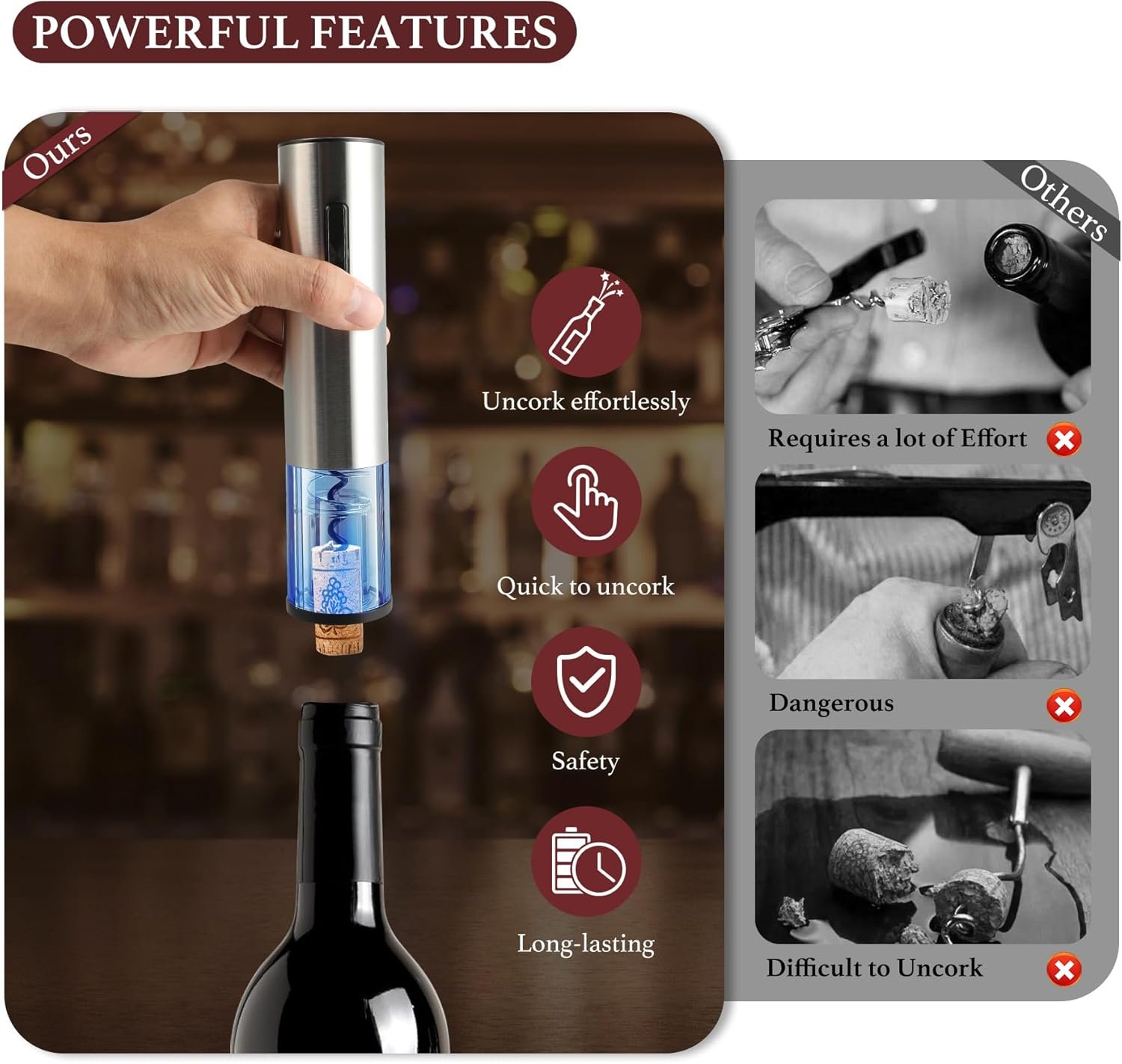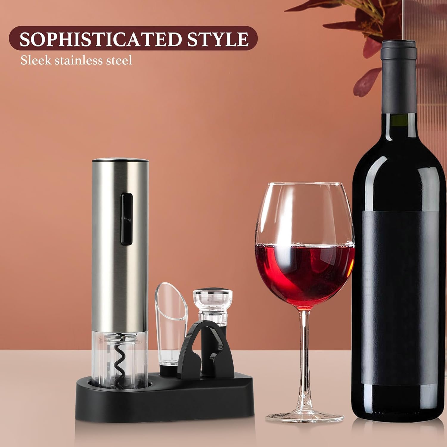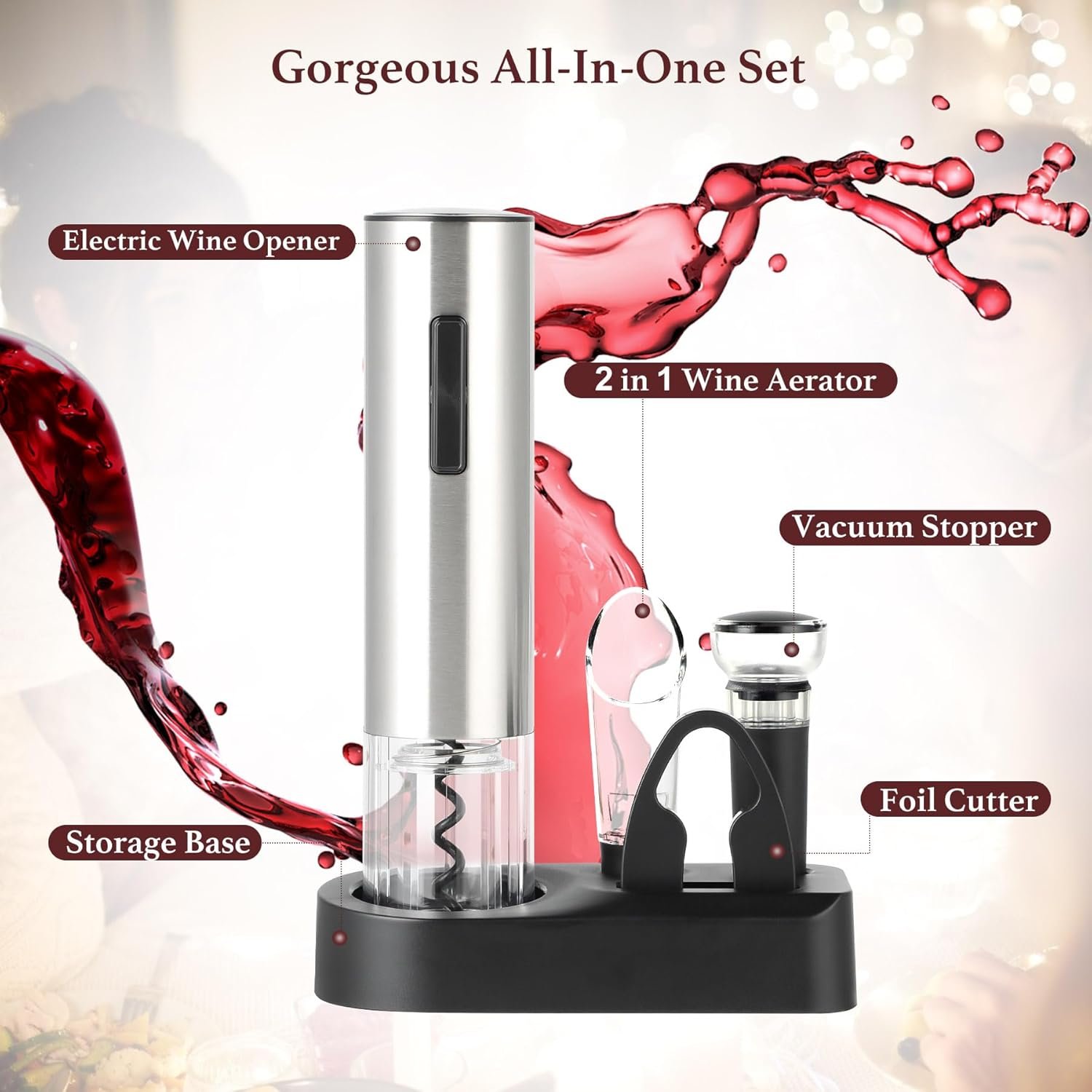 6-in-1 Wine Opener Gift Kit – Electric wine opener set is a gorgeous gift option for wine lovers. It includes an electric wine opener, 1 pourer, 1 vacuum stopper, foil cutter,holder,and charging cable. All the essentials are includes to enhance, preserve, pour, and enjoy your favorite wine varieties. Whether it’s a special occasion like Father’s Day, Friend-gathering, Birthdays, Anniversaries, Wedding, Christmas, Thanksgiving, or simply a housewarming gift, this wine set is perfect for any wine enthusiast.