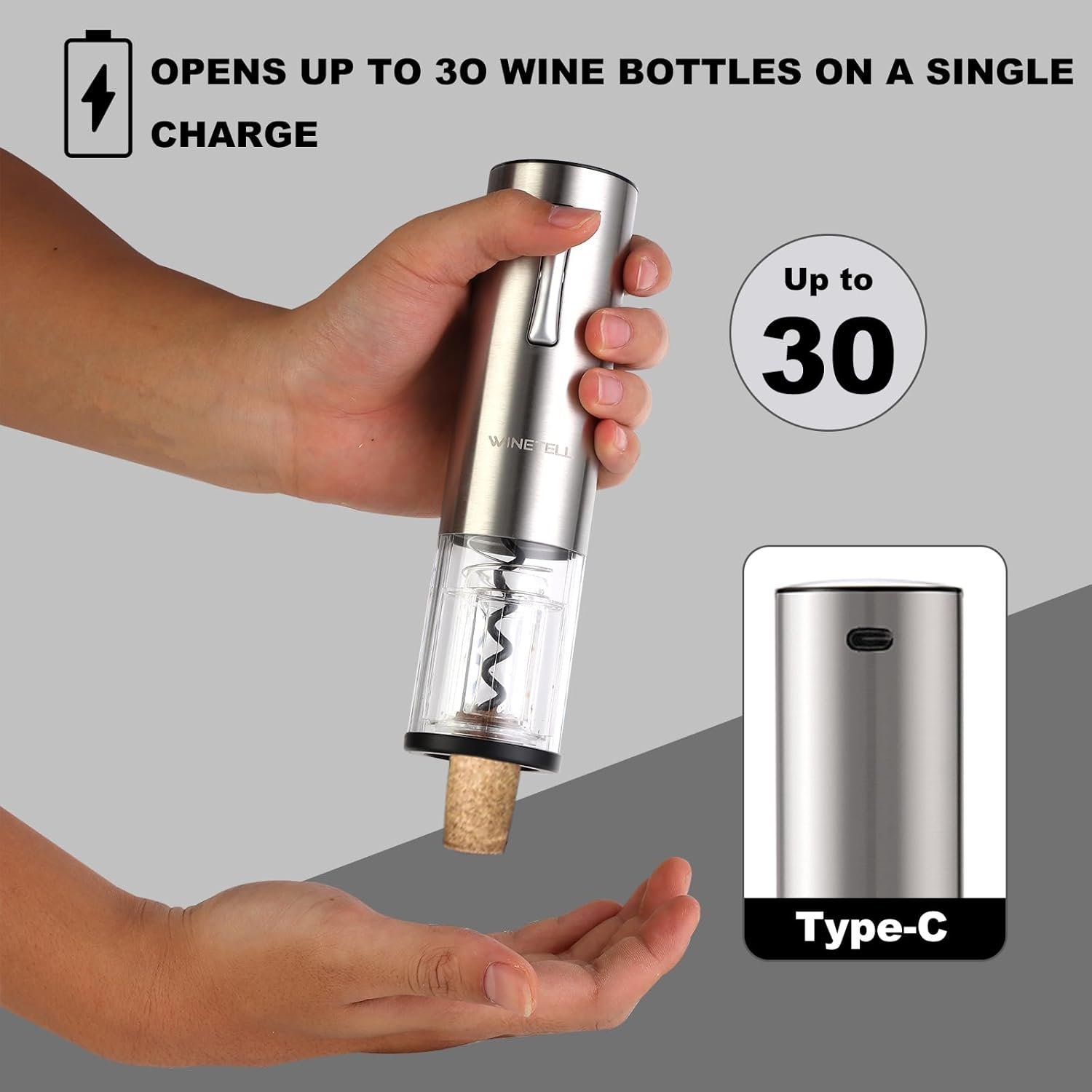 【Rechargeable and Long-Lasting】 No more hassle with batteries. Our electric wine bottle opener features a built-in rechargeable battery that allows you to open up to 30 bottles on a single charge. This reusable bottle opener charges via USB-C in about 2.5 hours, offering a convenient solution for wine lovers