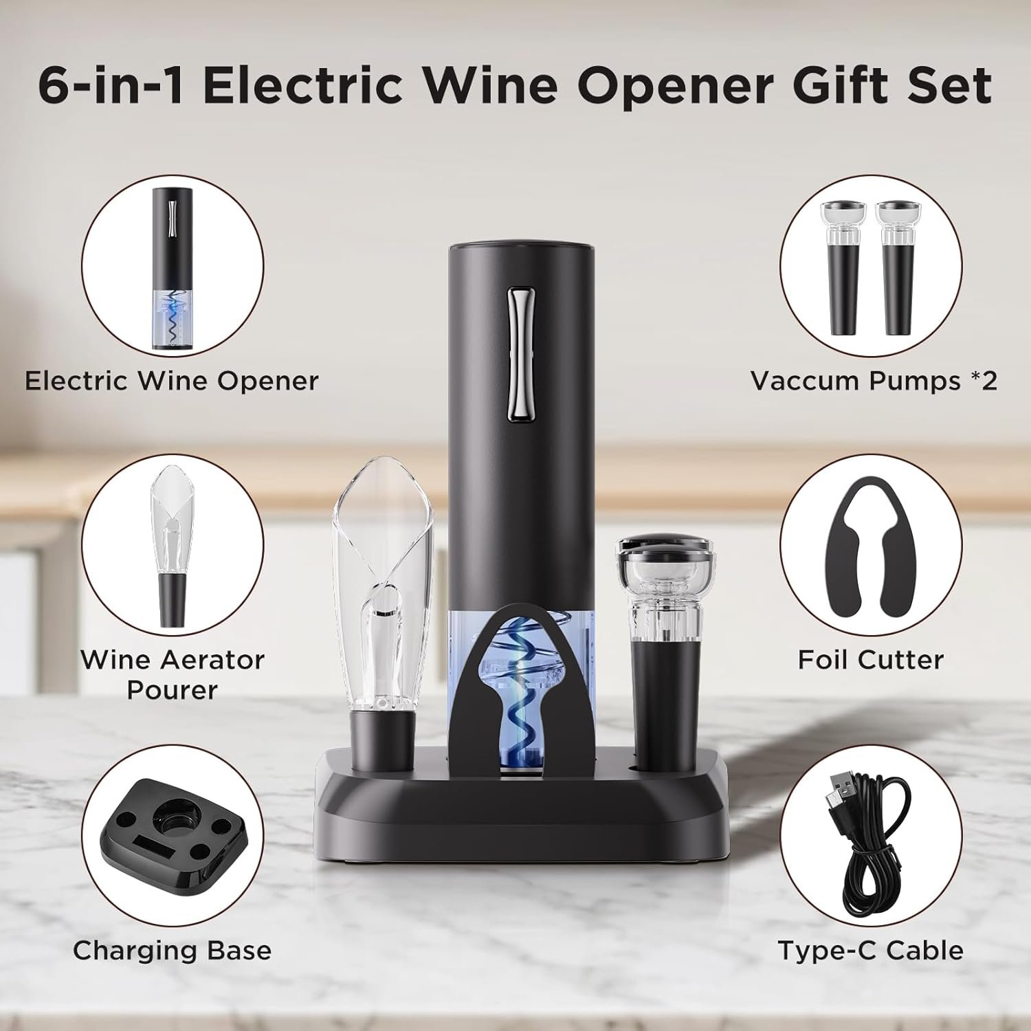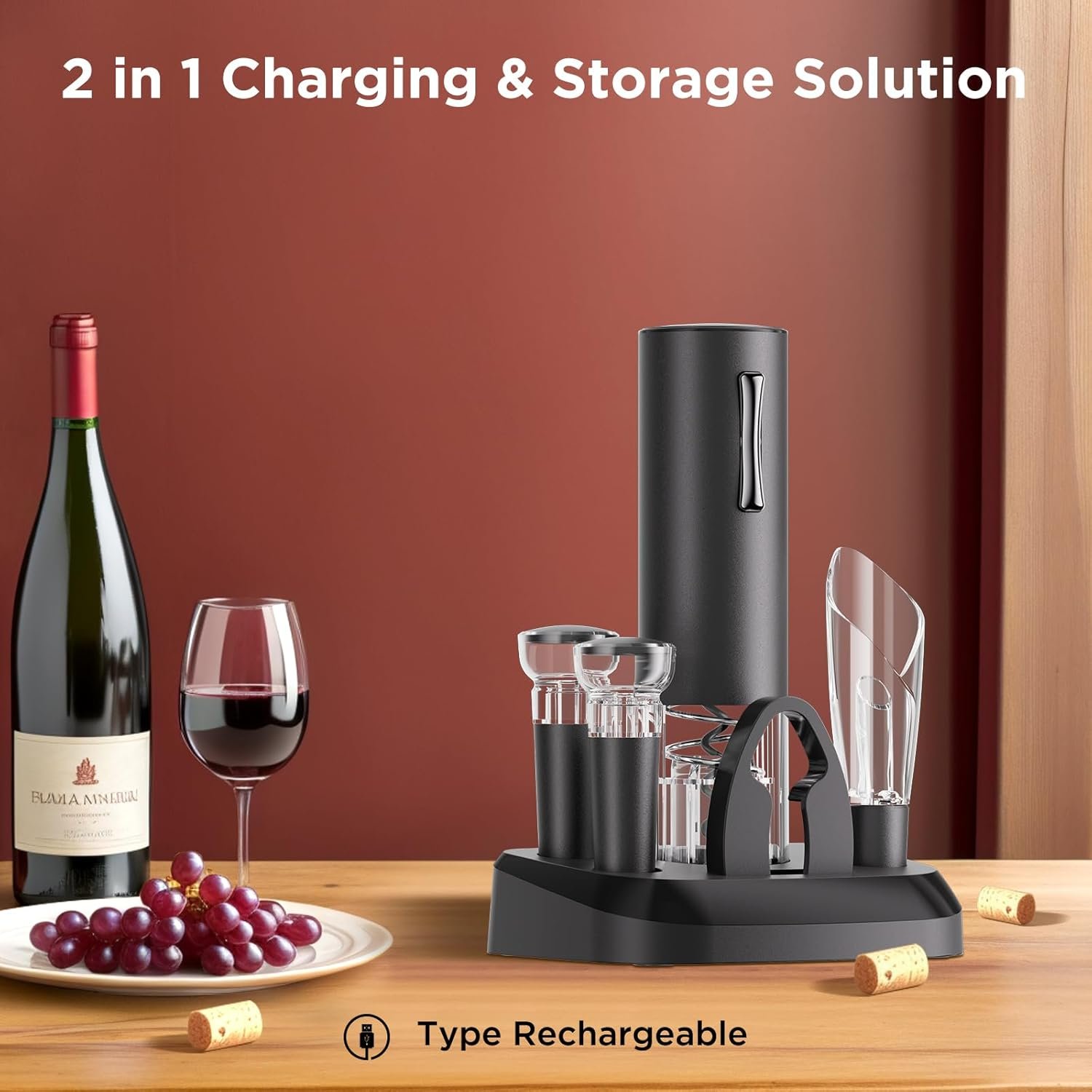 TEBIKIN Electric Wine Opener, Rechargeable with Charging Base, Automatic Wine Bottle Corkscrew Openers with Aerator Pourer, Foil Cutter, 2 Vacuum Preservation Stoppers, Gift Box Design, Wine Lovers Christmas Home Party.