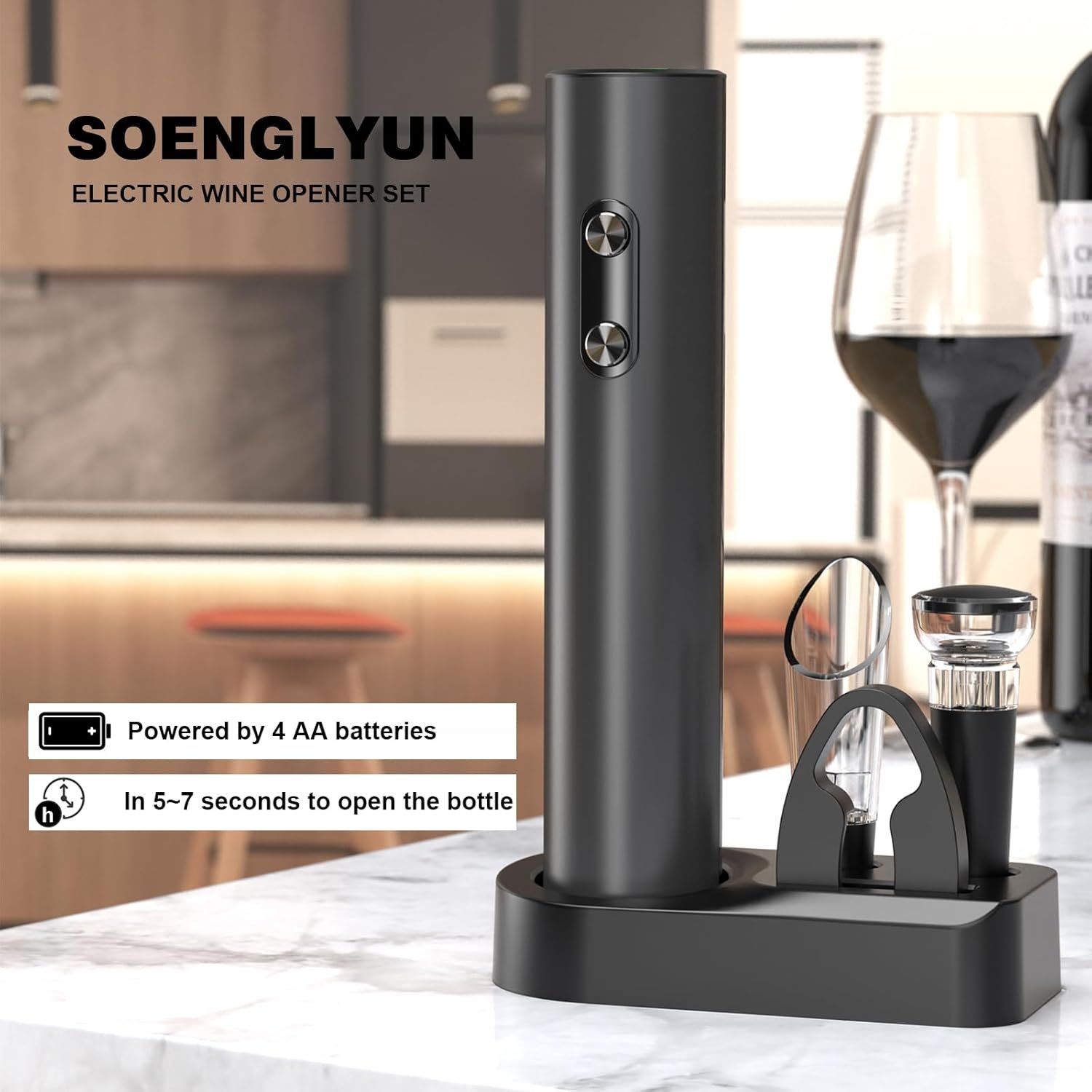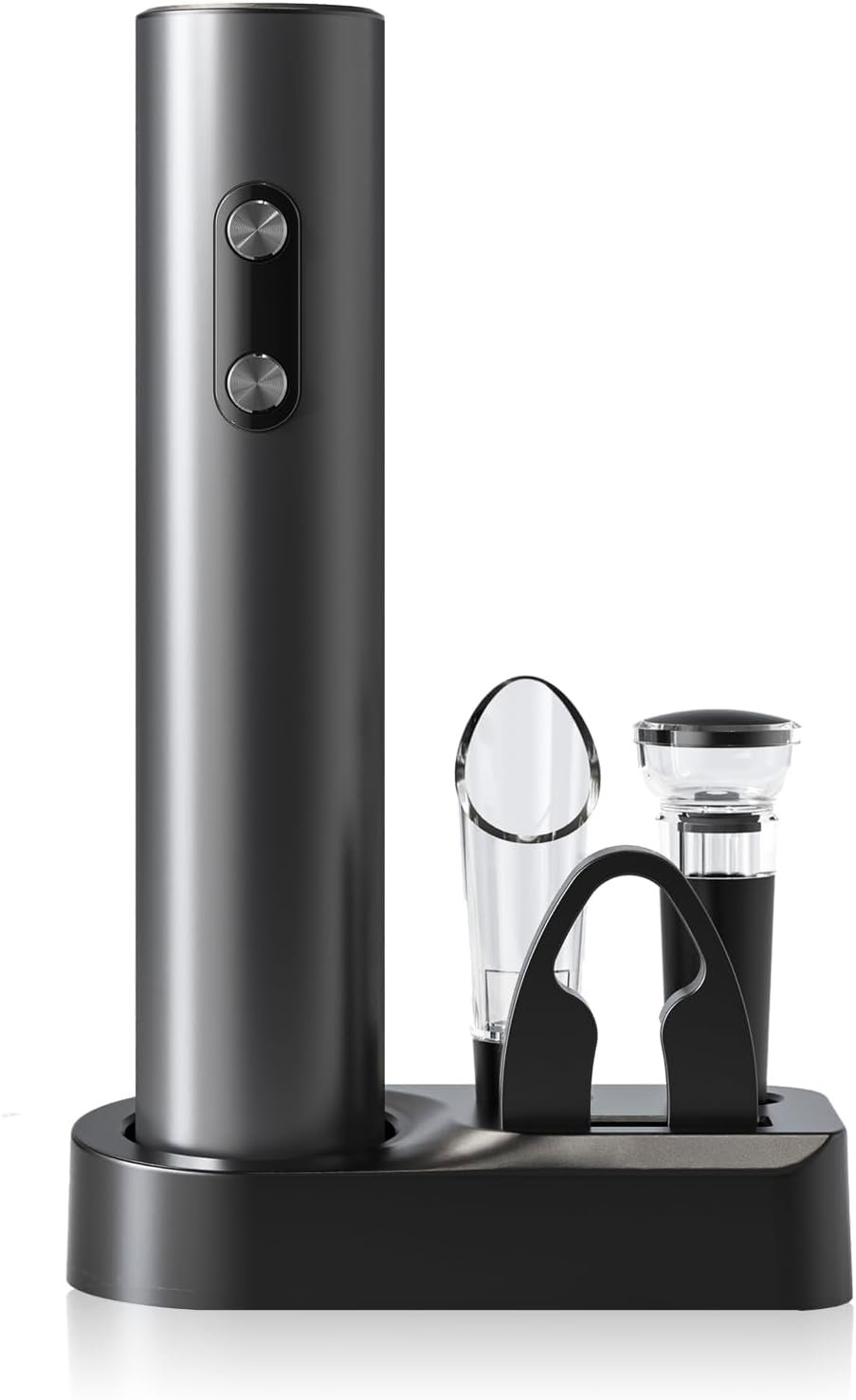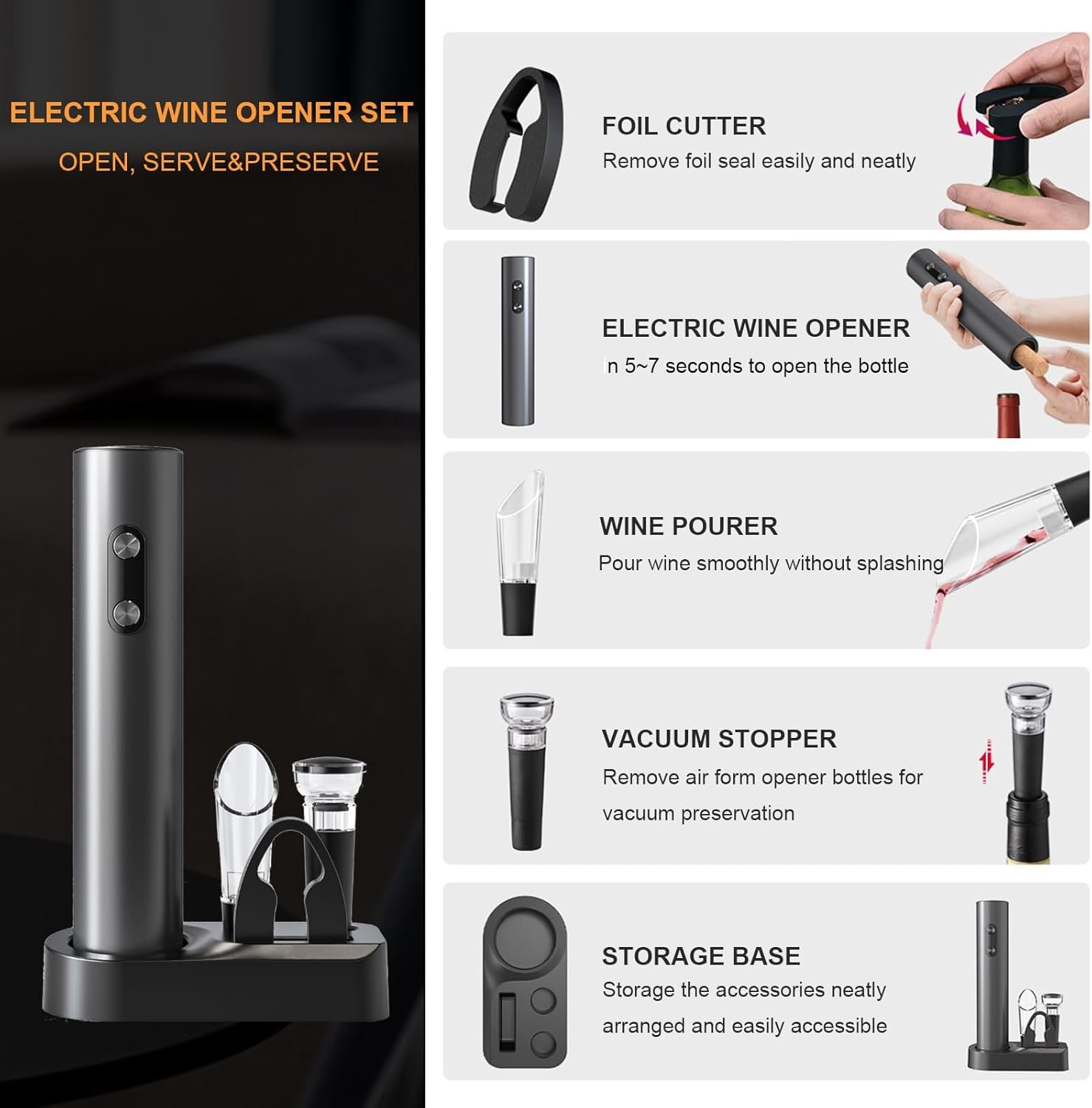 Electric Wine Opener Set: 5 in 1 set with automatic electric wine bottle opener, foil cutter, vacuum stopper, wine pourer and storage base for all components.