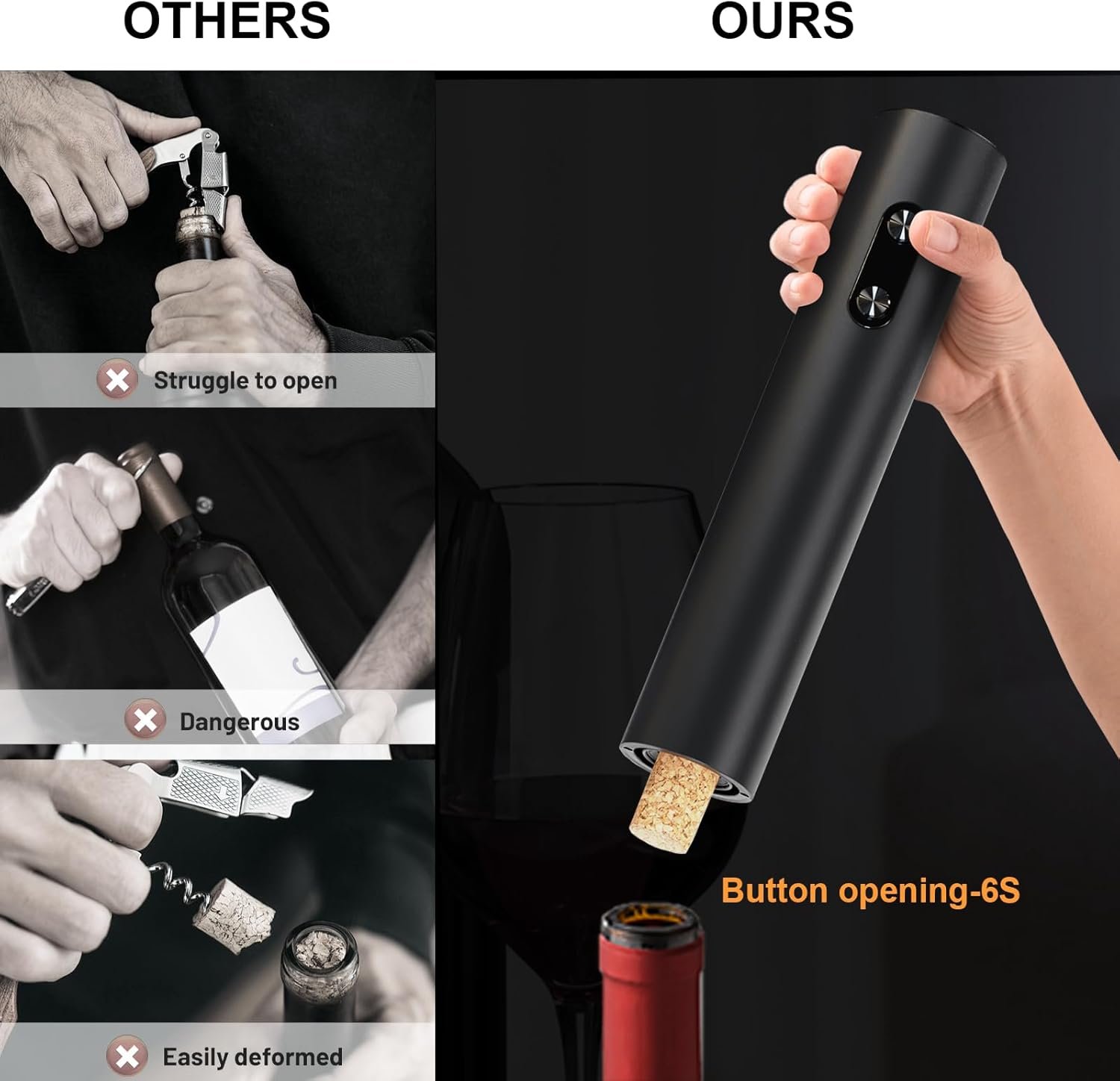 Easy Wine Corkscrew: Our electric wine opener can carefully extract the cork at the touch of a button. Press the release button to remove the cork from the corkscrew. Noiseless and fast, it can safely remove corks in about 6 seconds.