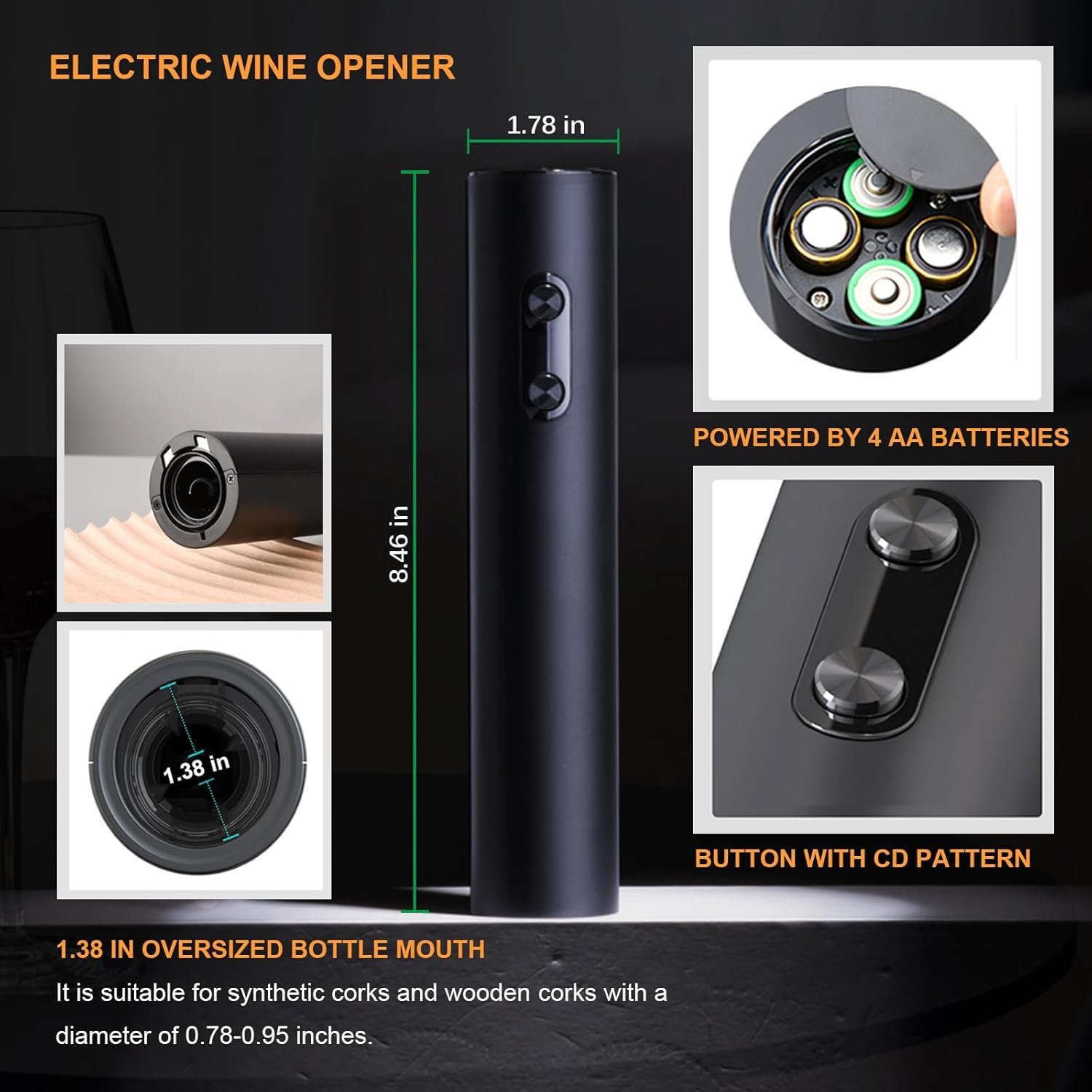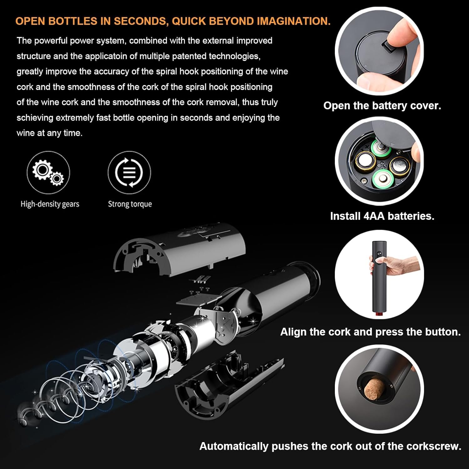 Battery Operated Wine Opener: Cordless battery operated wine bottle opener powered by 4 AA batteries (not included). It can open up to 100 wine bottles at one time.