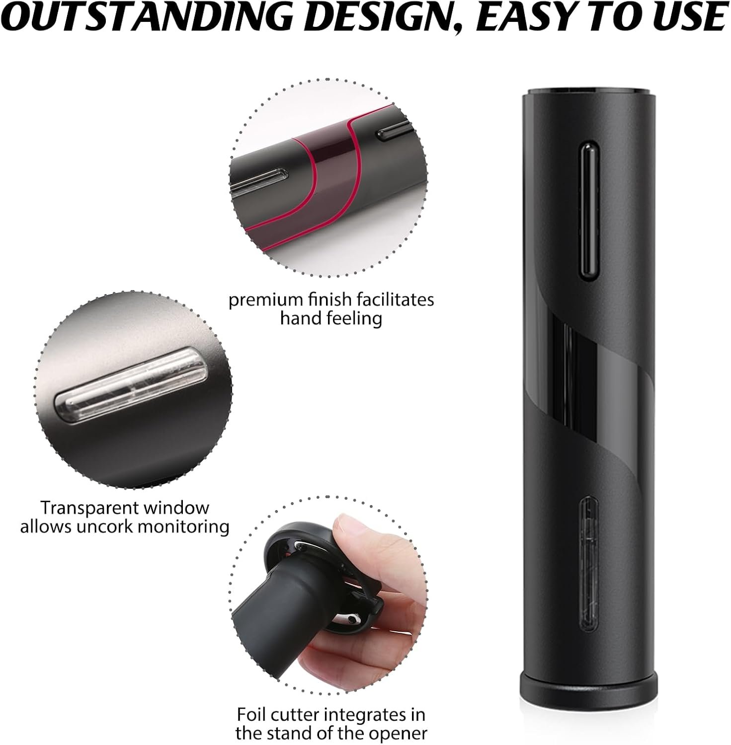 【EASY TO USE】The electric wine opener set makes you uncork and keep wine fresh with ease. By pressing one button, the wine cork can be smoothly extracted. The wine stopper with “rotate and lock” design is easy to use. The electric wine opener integrates foil cutter at the bottom and a fully automatic corkscrew. Clear and concise instructions are attached to the package.
