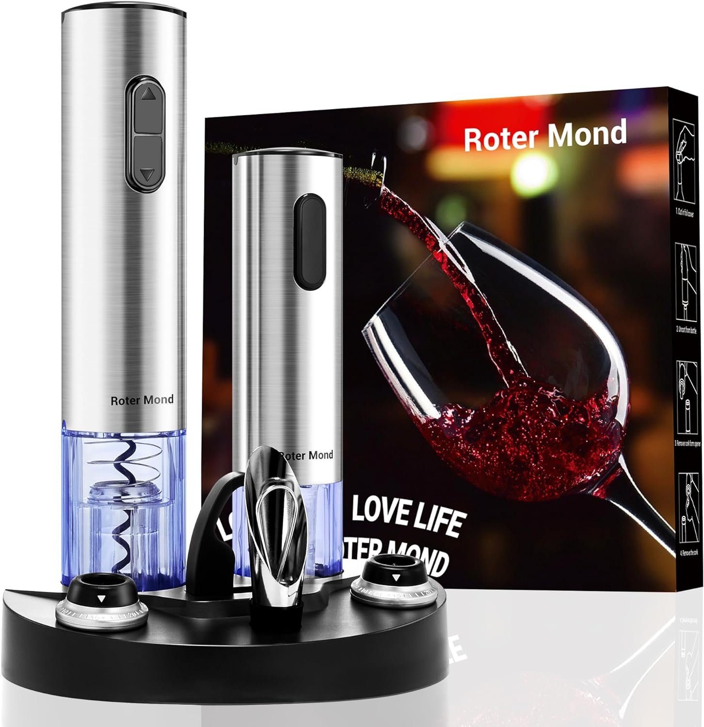 Electric Vacuum Preserver: Different from other manual vacuum pumps, the electric vacuum preserver in the Roter Mond wine bottle opener set will save time and effort.You can extract air automatically, and seal the opened wine with the included stoppers to extend the freshness of the wine.