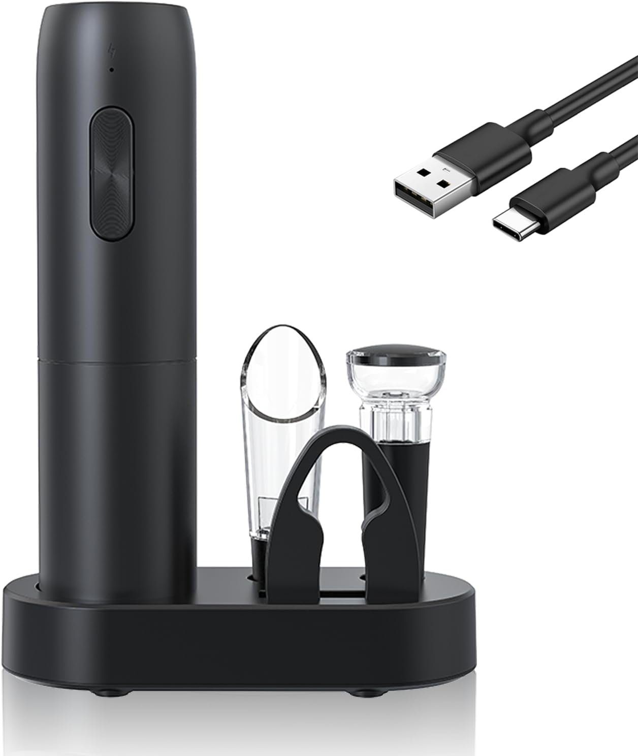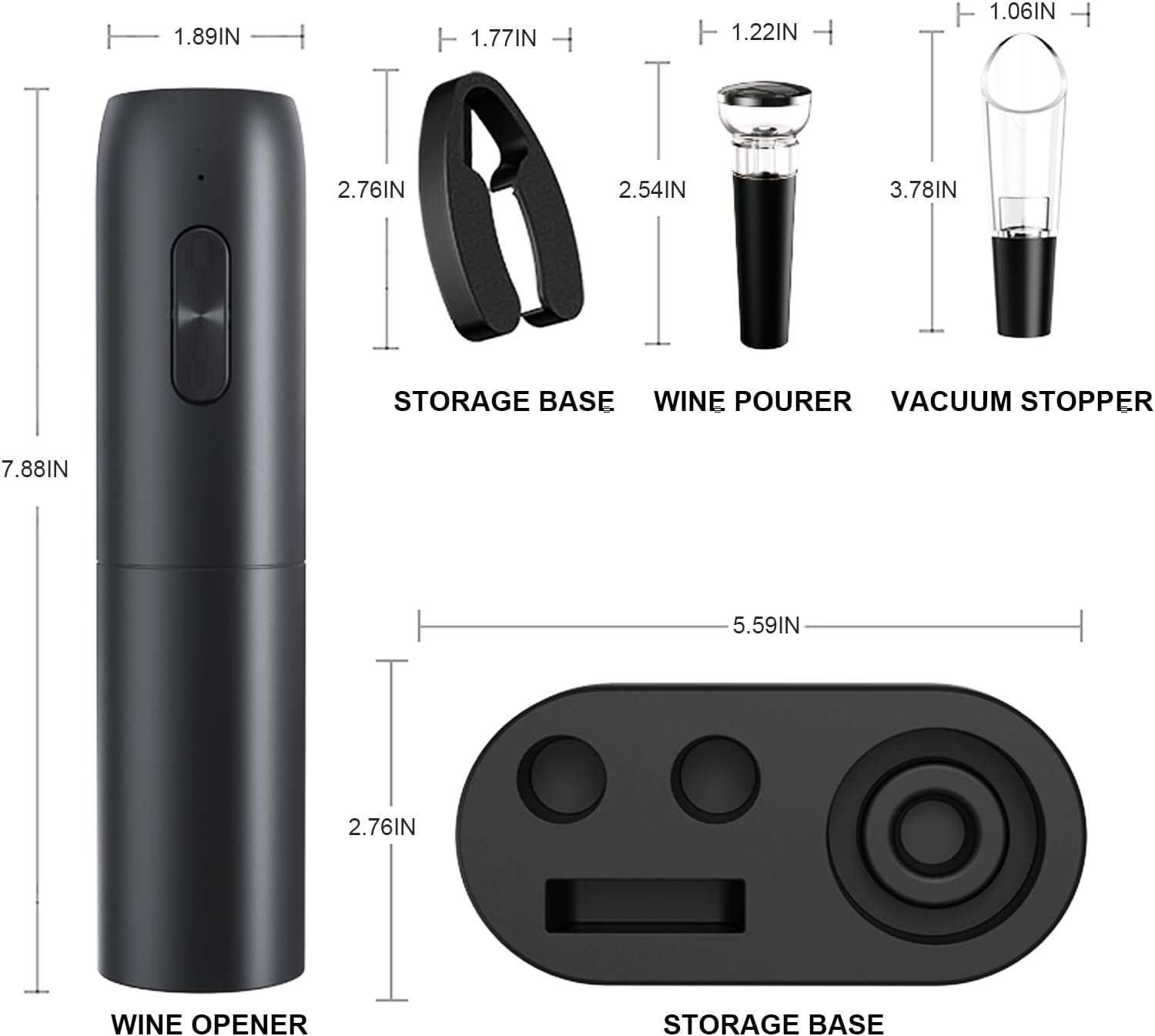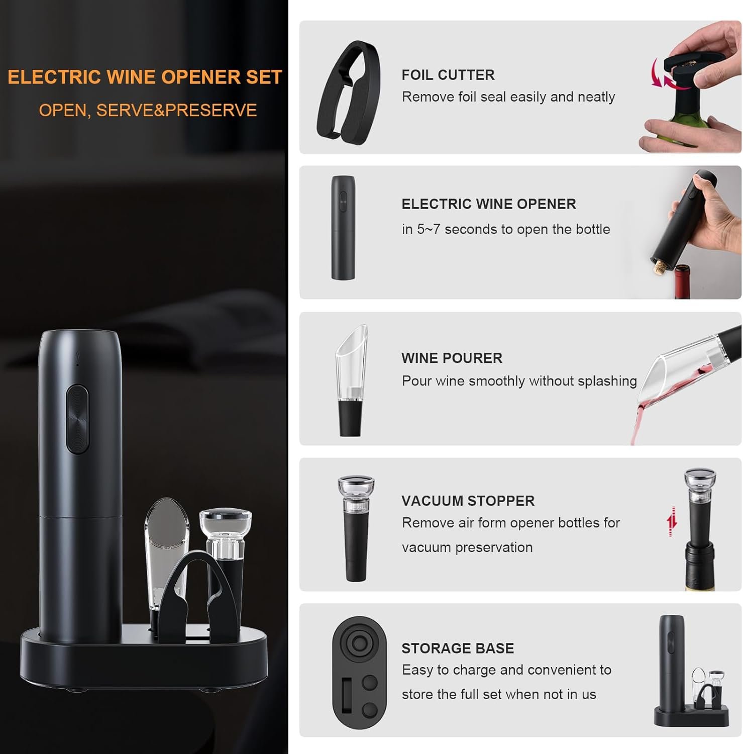 Wine Opener Electric Set: 5 in 1 set with automatic electric wine bottle opener, foil cutter, vacuum stopper, wine pourer and storage charging stand for all components.