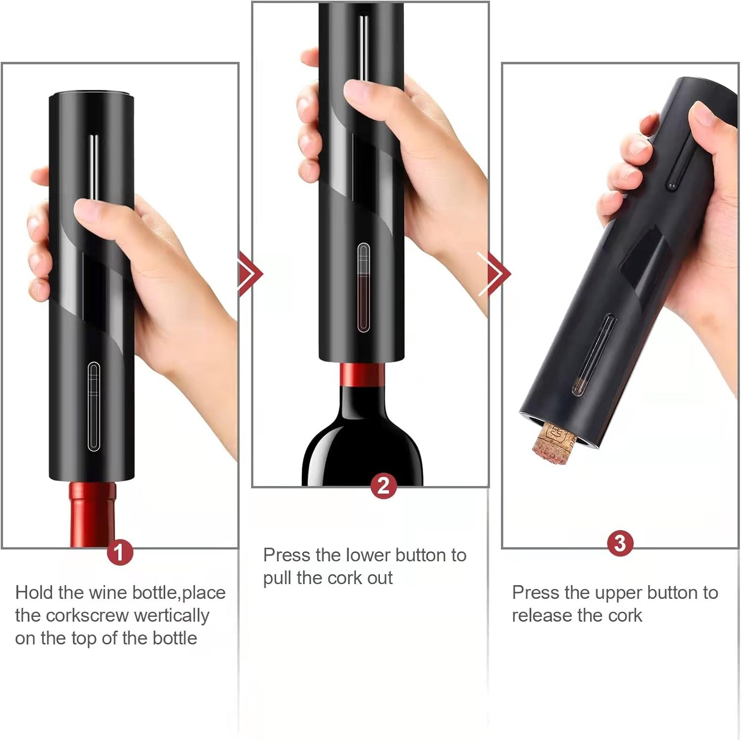 【Easy to operate, fast opening】Electric wine opener after fully charged, it can open 40-50 bottles continuously. Rechargeable wine opener can remove the cork in 5-7 seconds by pressing the “down” and “up” buttons. With this wine opener set, you can easily open the bottle and pour the wine easily.