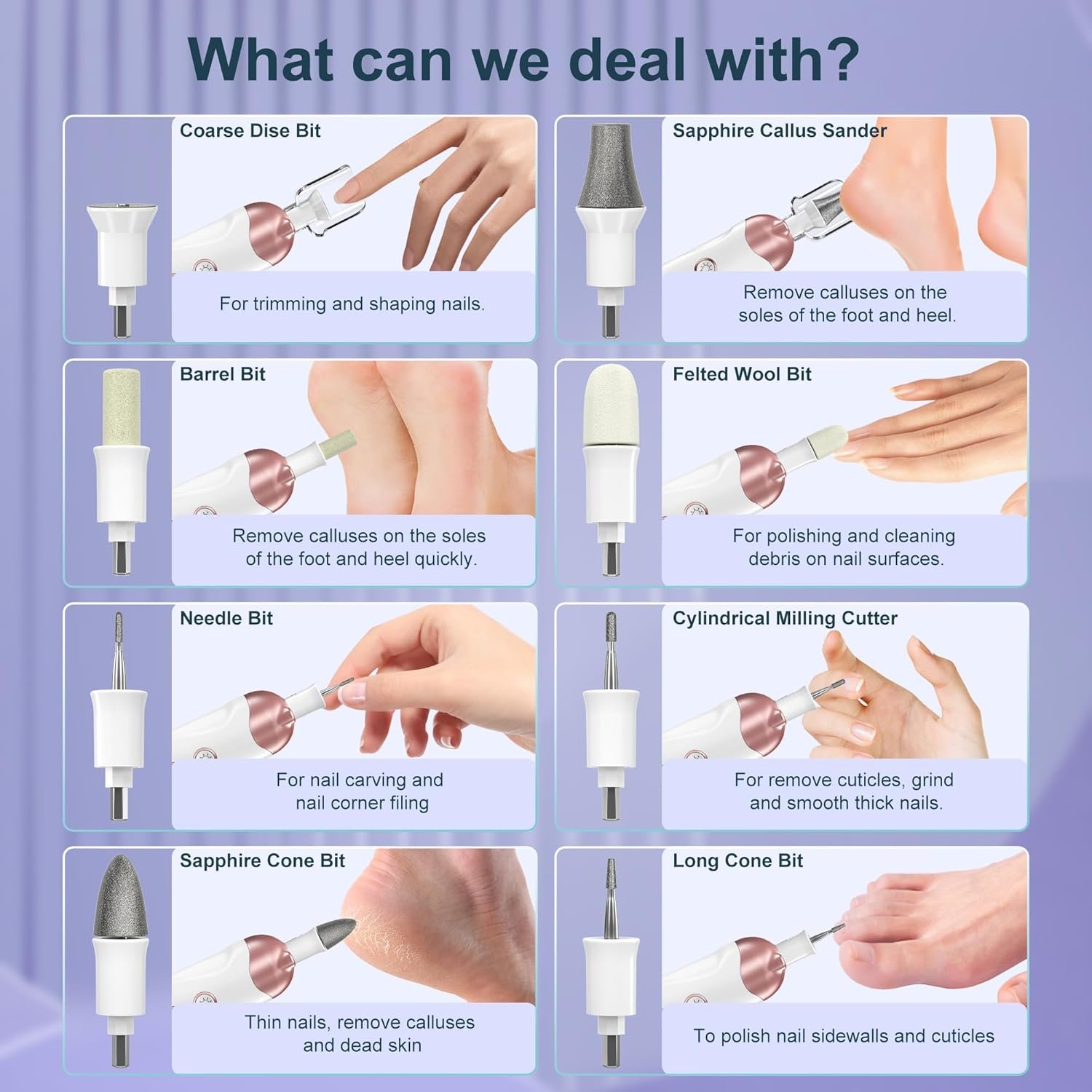 Professional Manicure and Pedicure Set: Designed for hand and foot care experience at home, the salon-quality electric nail file for women is suitable for trimming, grinding and polishing natural nails and thick nails. It also effectively removes cuticles, calluses, dead skin, corns, and hard skin, giving you healthy and neat nails, as well as comfortable hand and foot care.