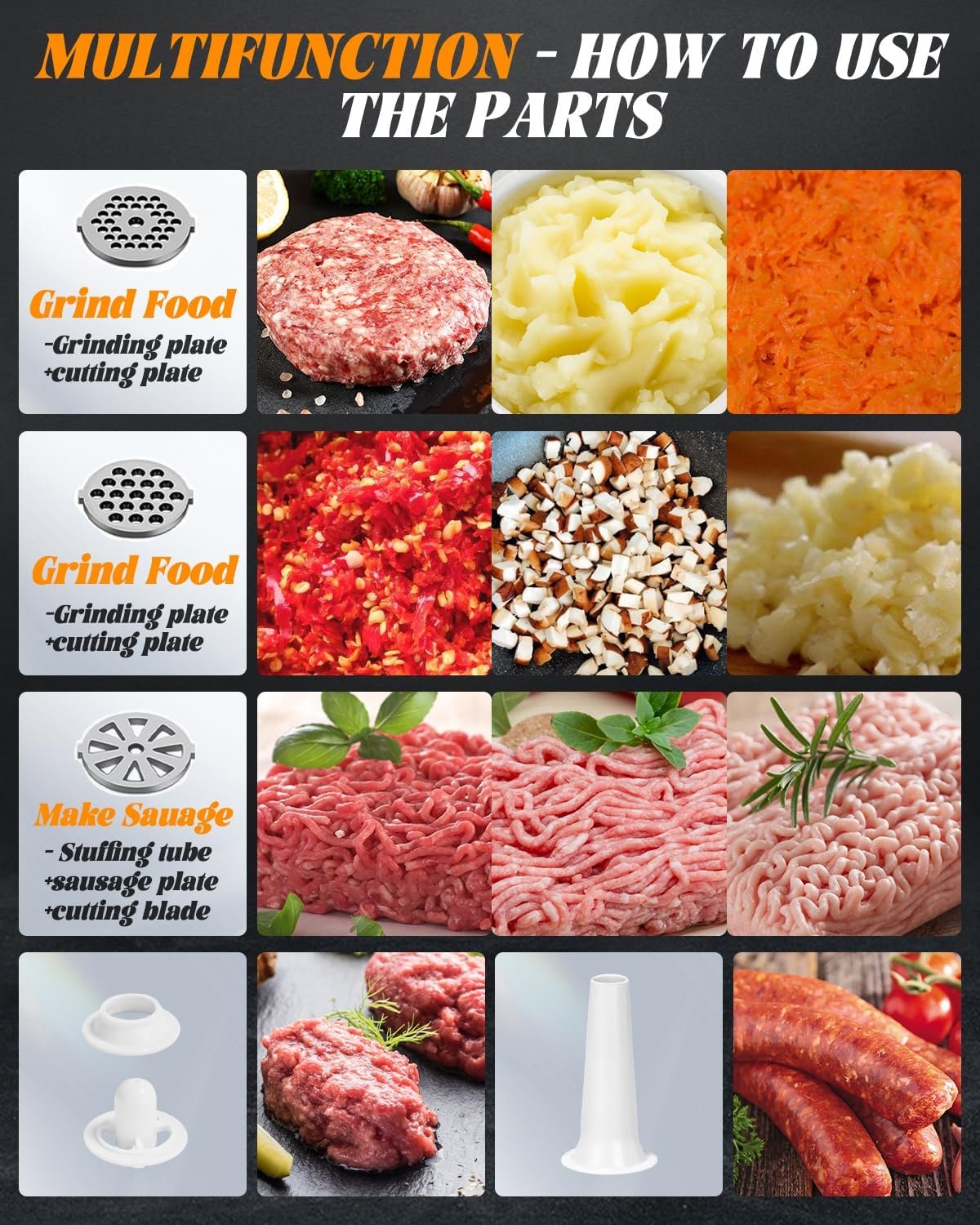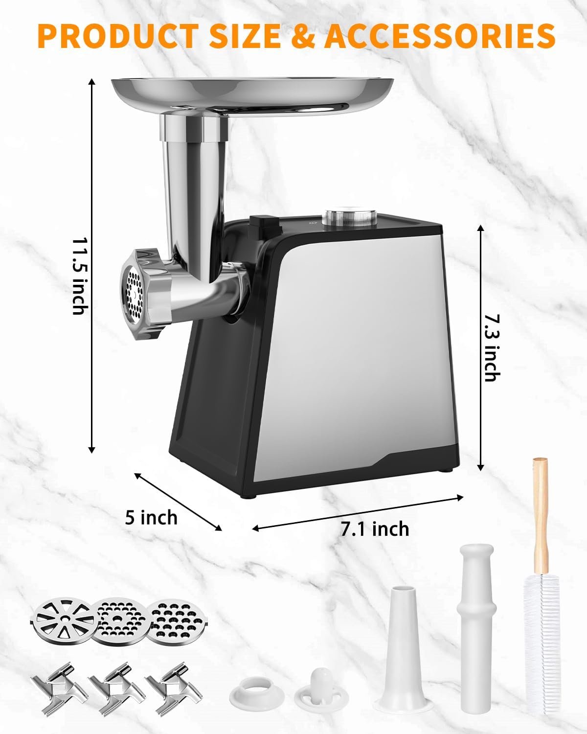 【VERSATILE MEAT GRINDER】 – This all-in-one food grinder includes 3 cutting blades, 3 grinding plates of different sizes, 1 sausage kit, 1 kubbe attachment, 1 food pusher and extra cleaning brush. The machine works as a meat grinder, sausage stuffer and kubbe maker, offering versatility in your kitchen tasks. Made with sharp and durable stainless steel blades and food grade plates, it’s perfect for grinding a variety of foods such as beef, chicken, garlic, chili and more.