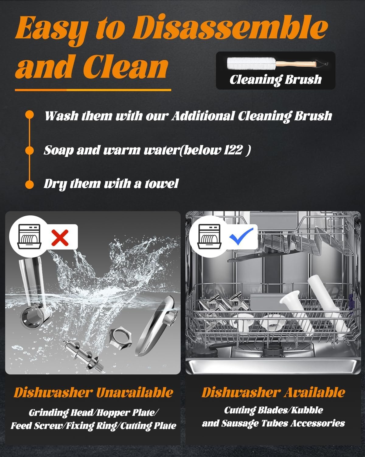 【USER-FRIENDLY DESIGN & EASY TO CLEAN】 – Please note that this product is not dishwasher safe. This meat grinder is incredibly easy to clean, assemble or disassemble. For cleaning, be sure to thoroughly wash all parts with warm water below 164℉ and a neutral detergent. After cleaning the accessories, be sure to dry them thoroughly with a cloth before assembling and storing them. Contributes to prolonging the longevity of use.