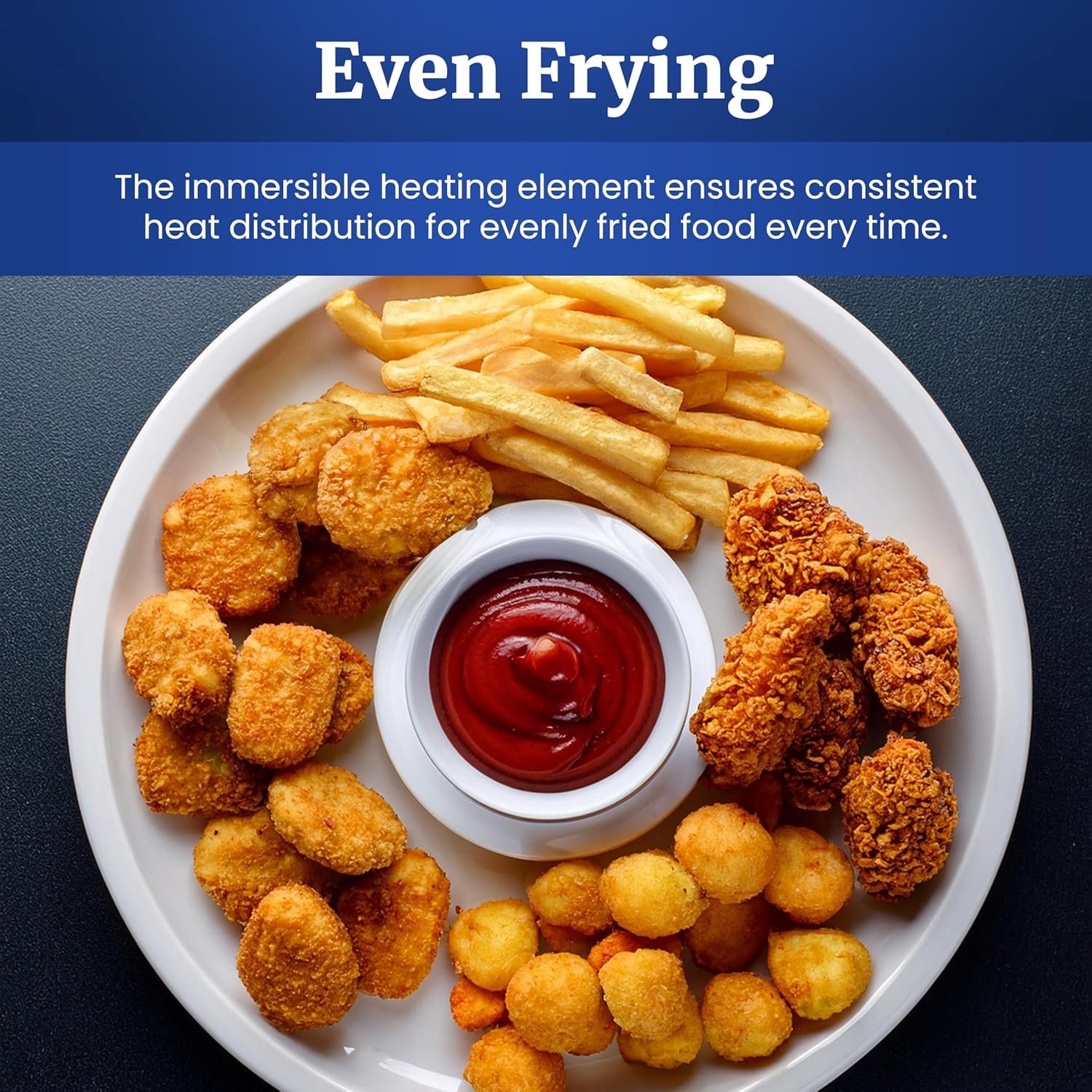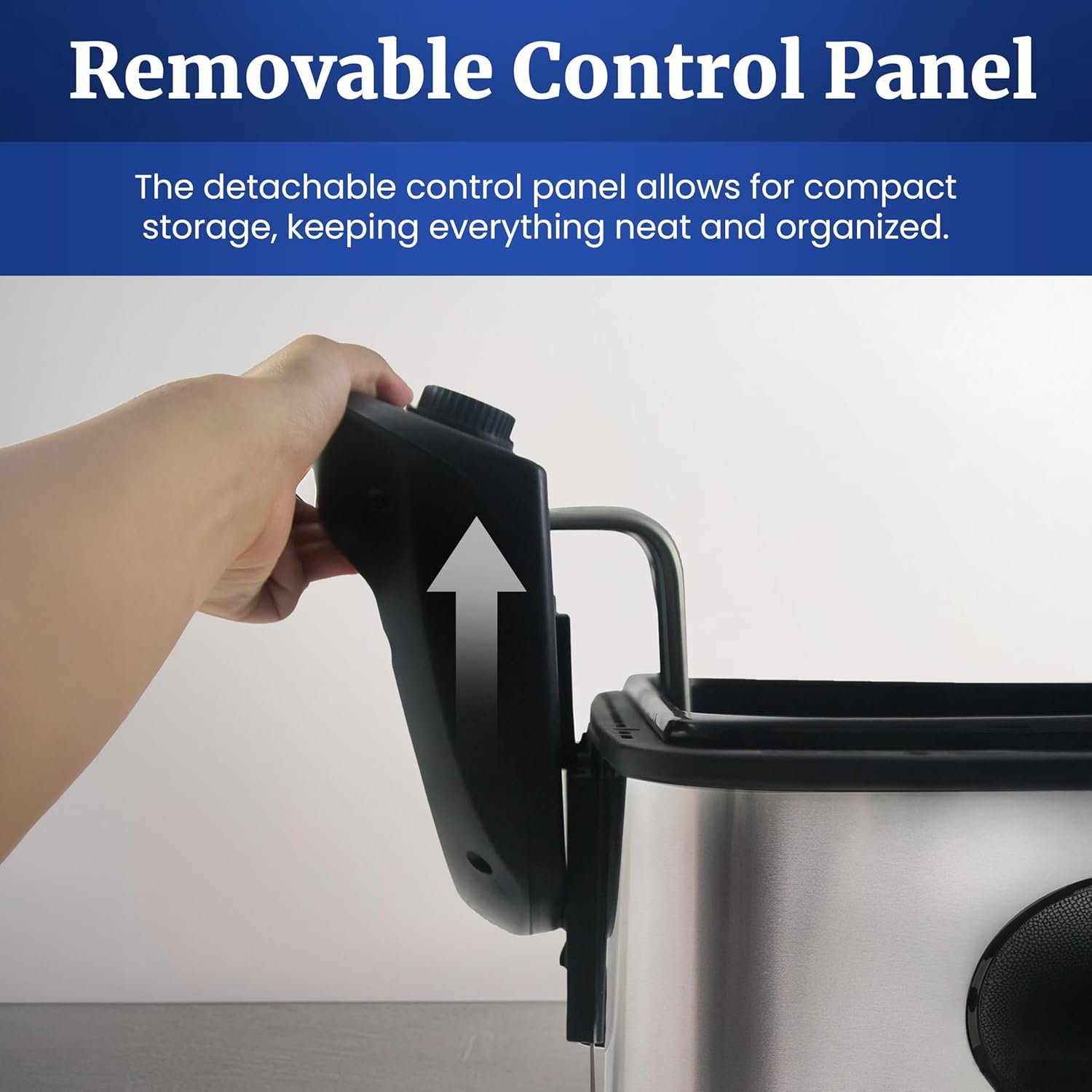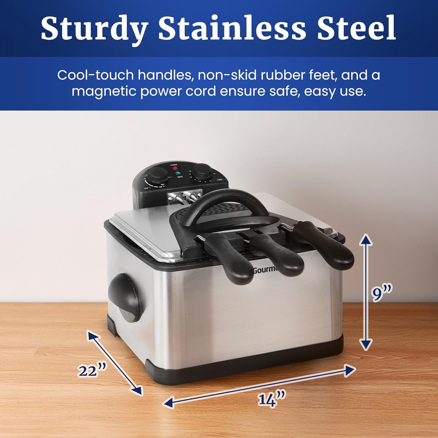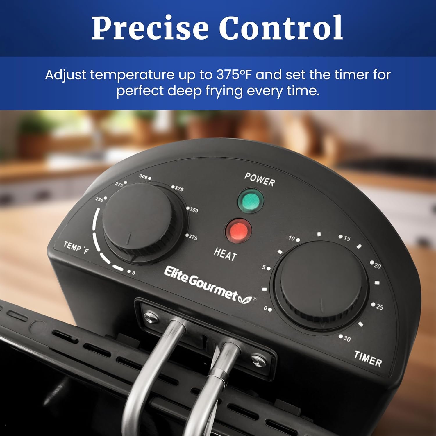 Immersible Heating Element: with power and ready indicator lights is easily removable for hand washing. Temperature Control Knob up to 375 degrees Fahrenheit and Timer Knob for the ultimate control while deep frying.