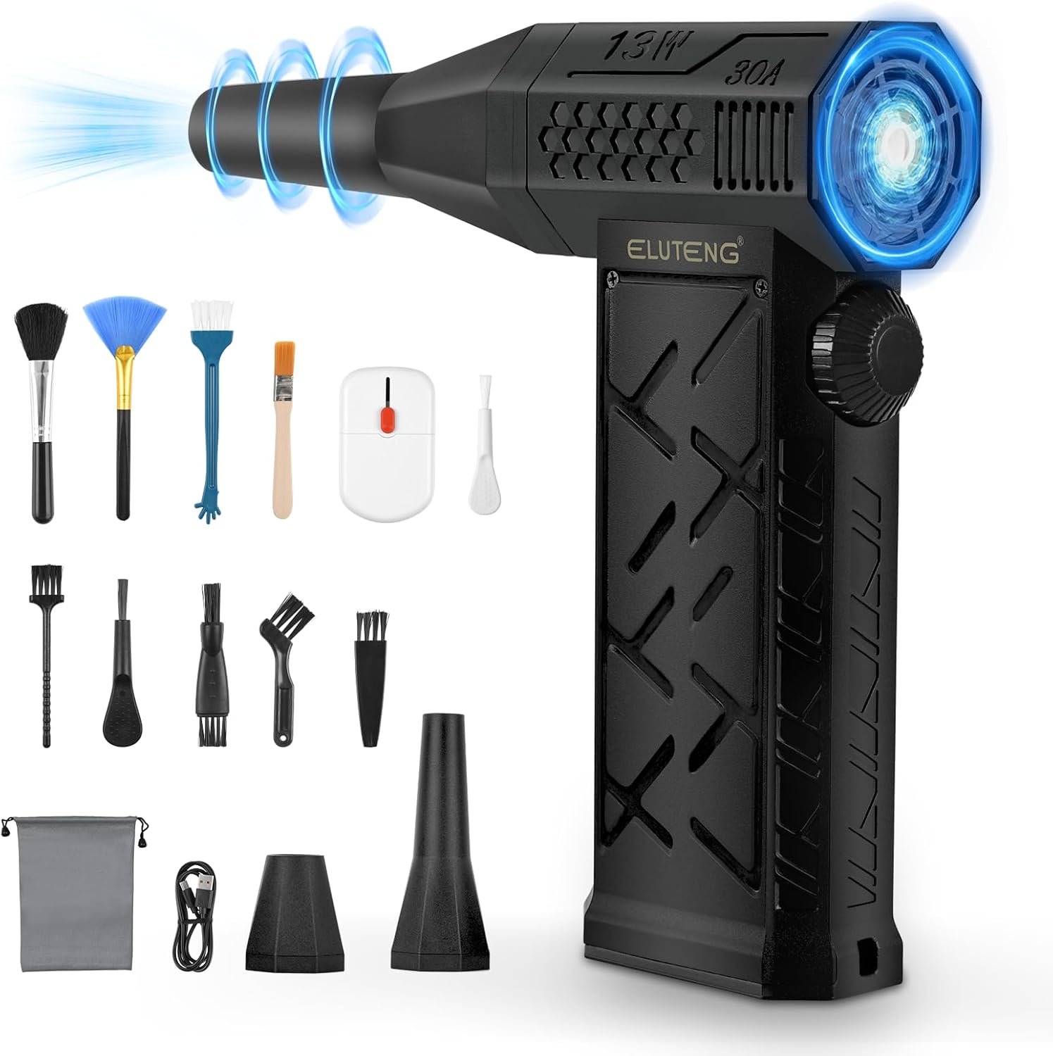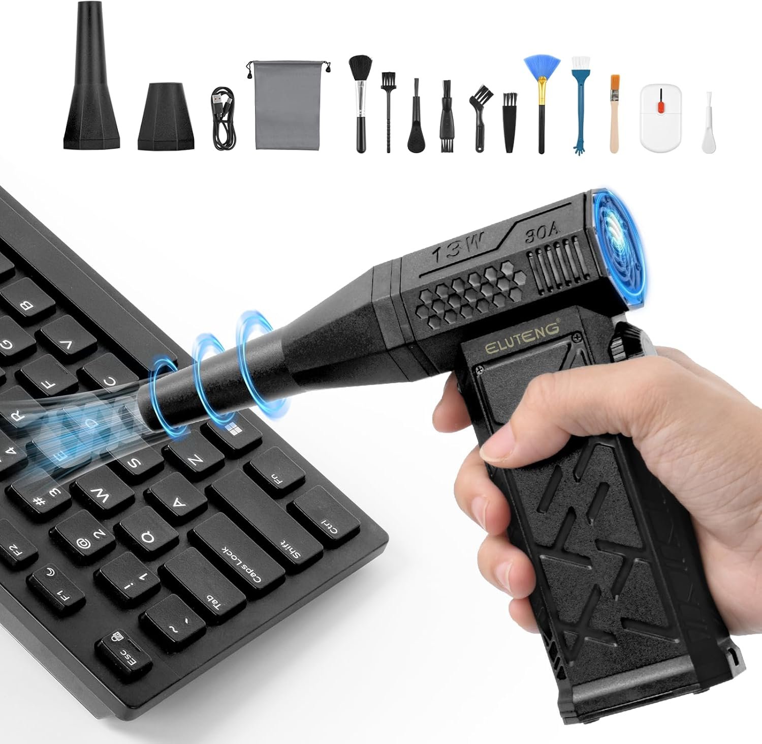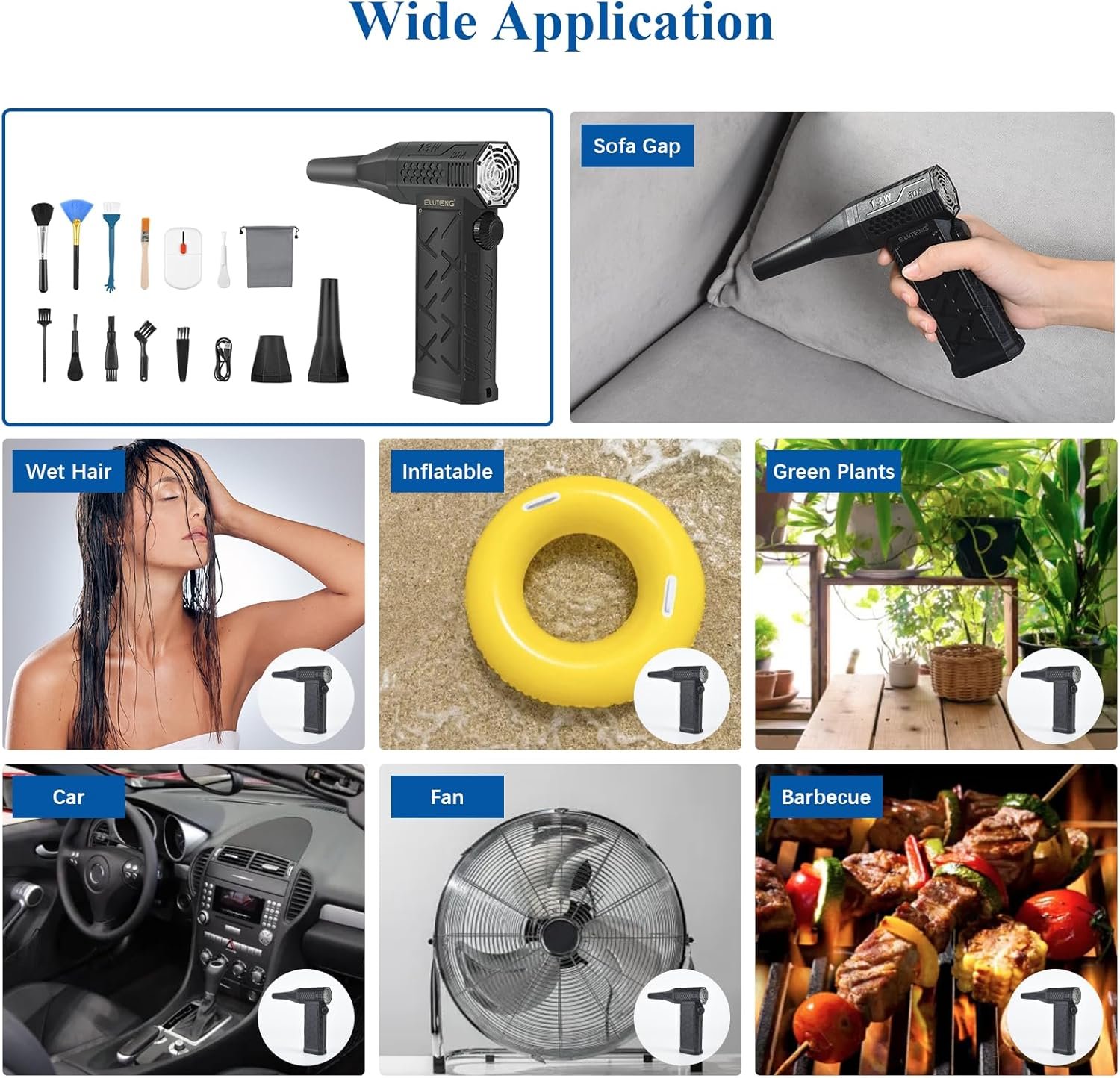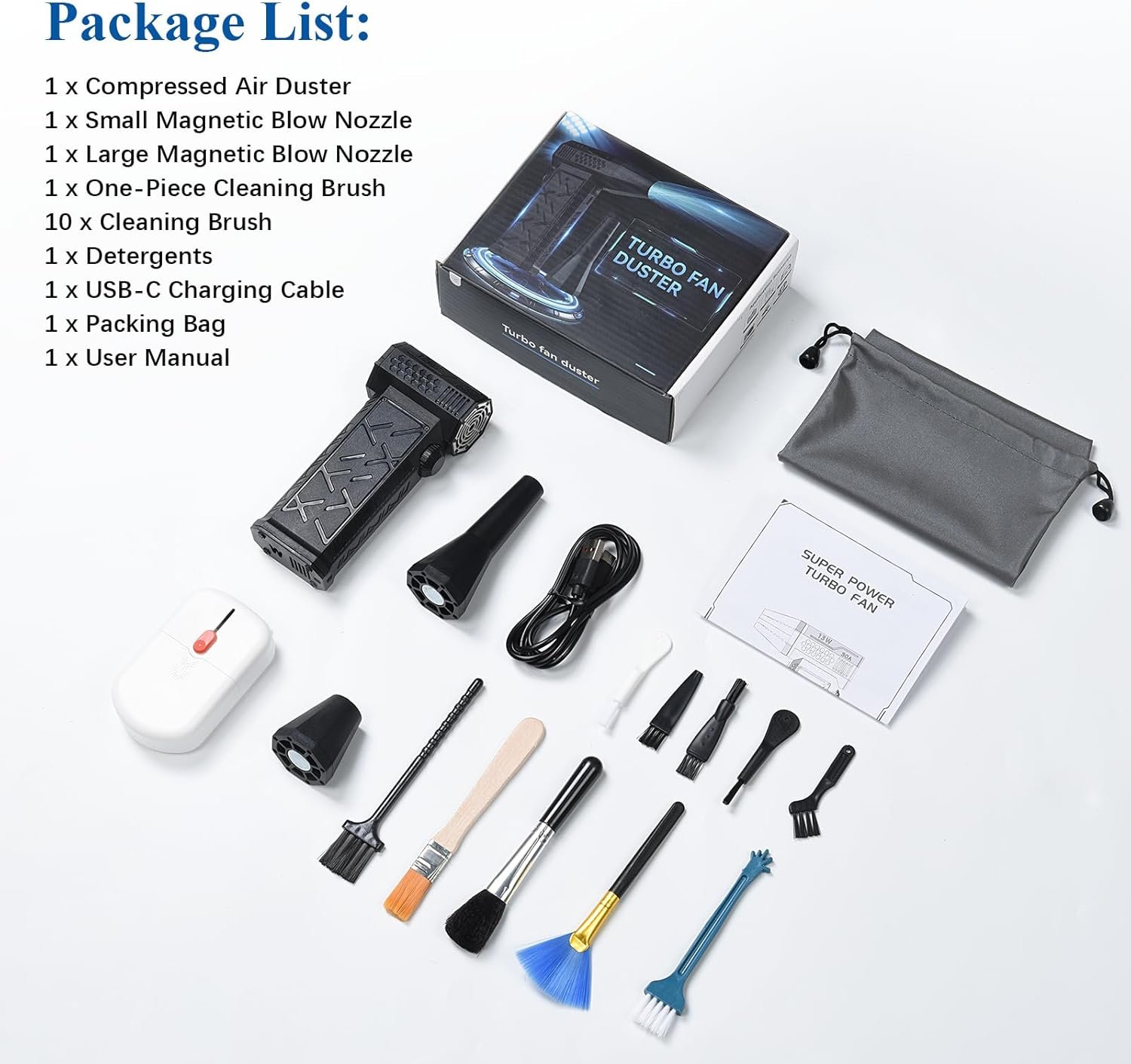 【Multiple Accessories】ELUTENG computer duster is equipped with: 1 small magnetic blow nozzle, 1 large magnetic blow nozzle, 1 cleaning brush, 10 cleaning brush kit, 1 detergents, 1 USB-C charging cable, 1 storage bag and 1 user manual. It is specially designed for cleaning different areas, delivering you a powerful deep cleaning.