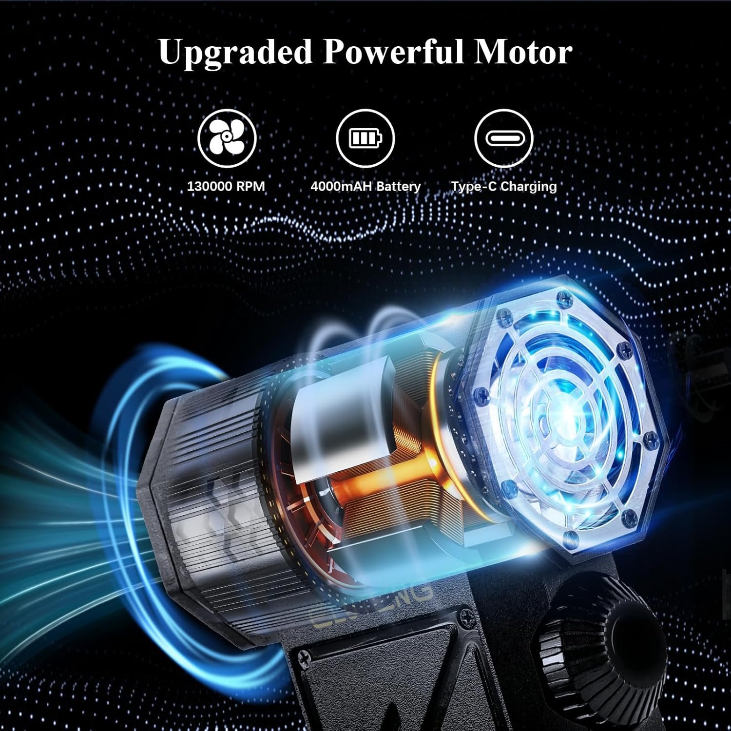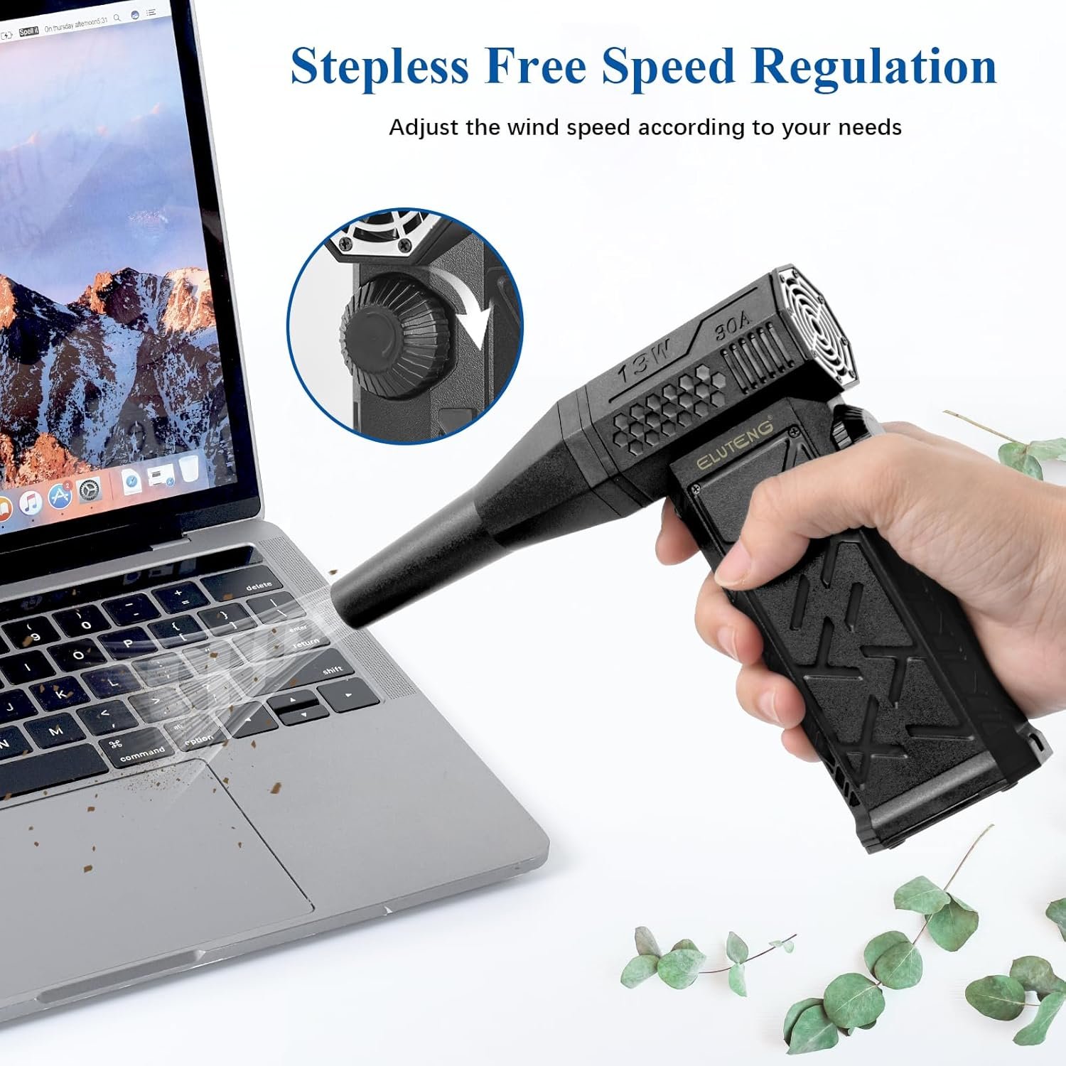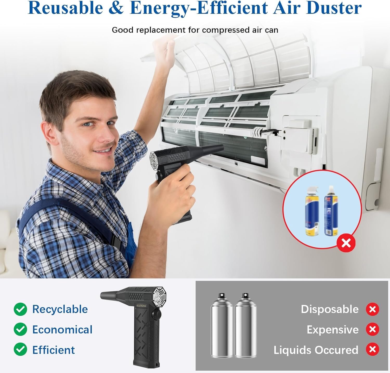 【130,000 RPM Compressed Air Duster】The max rotating speed of wireless electric air duster is 130,000RPM, continuously producing high-pressure air to eliminate dust and clear the dirt hidden in various gaps on the keyboard or any electronic devices. An great alternative to compressed air cans, it can be used multiple times and is energy-efficient.