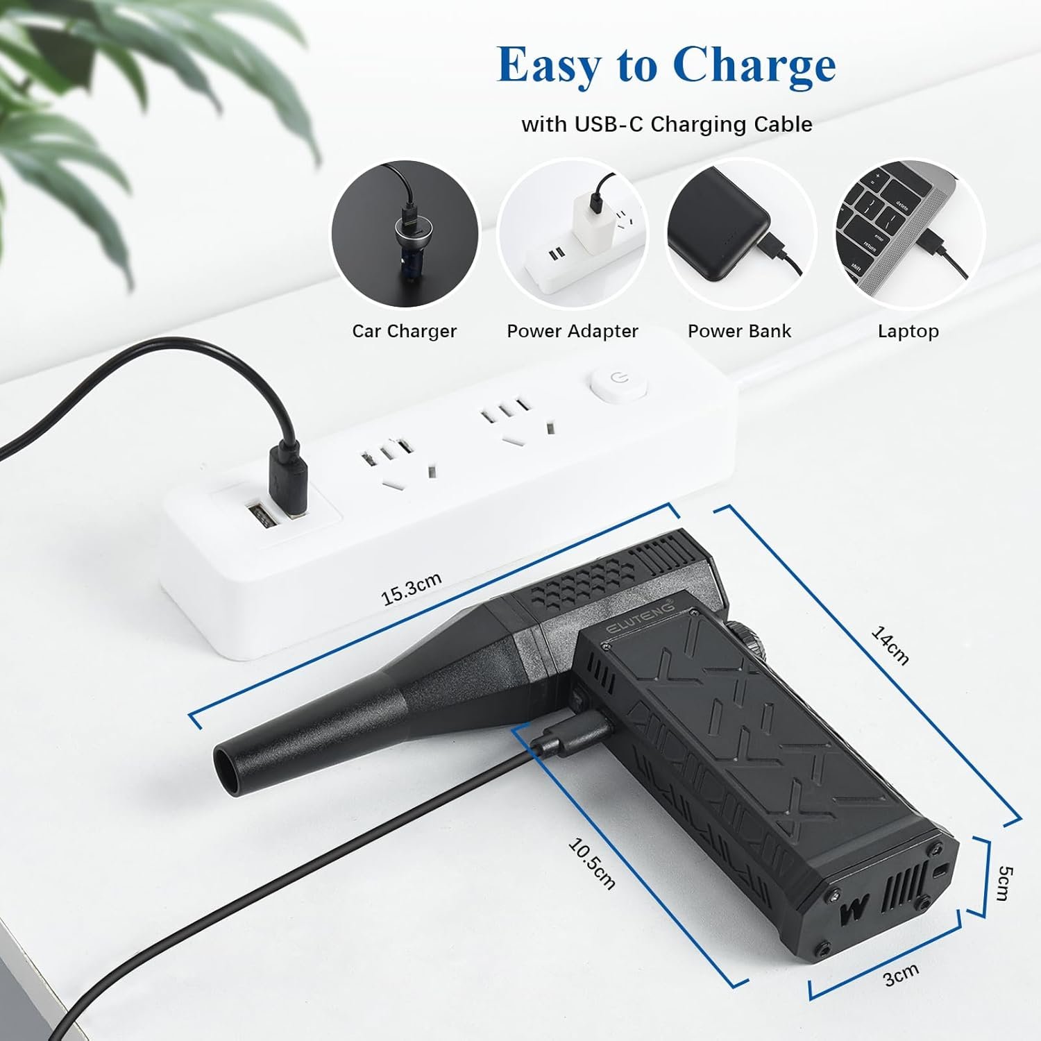 【4000mAh Long Duration Battery】The cordless dust collector boasts a built-in 4000mAh battery (2 x 4,000mAh connected in series) , which can run continuously for up to 40 minutes. It takes about 3-4 hours to fully charge the rechargeable air duster. Included a USB-C fast charging cable, the air duster can be charged by computer, mobile power supply, car charger and wall charger.
