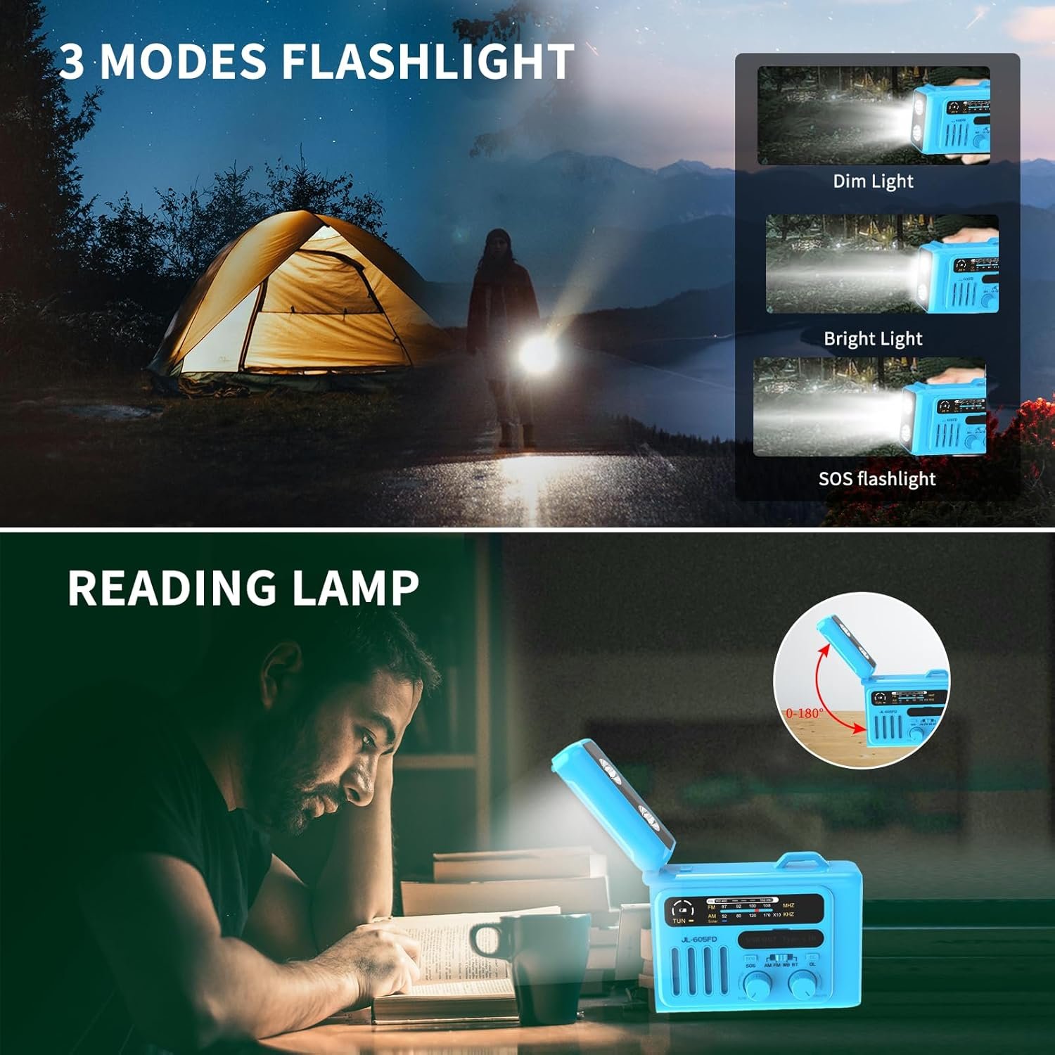 【Double Flashlight + Reading Light, Super Loud SOS Alarm】This solar hand crank radio integrates a practical multi-functional with a super bright three-mode LED flashlight and reading light Perfect for at home and outdoor.The device also has an SOS emergency alarm function with a strong sound.compass, can help outdoor Whether it is for emergency use or outdoor adventure.