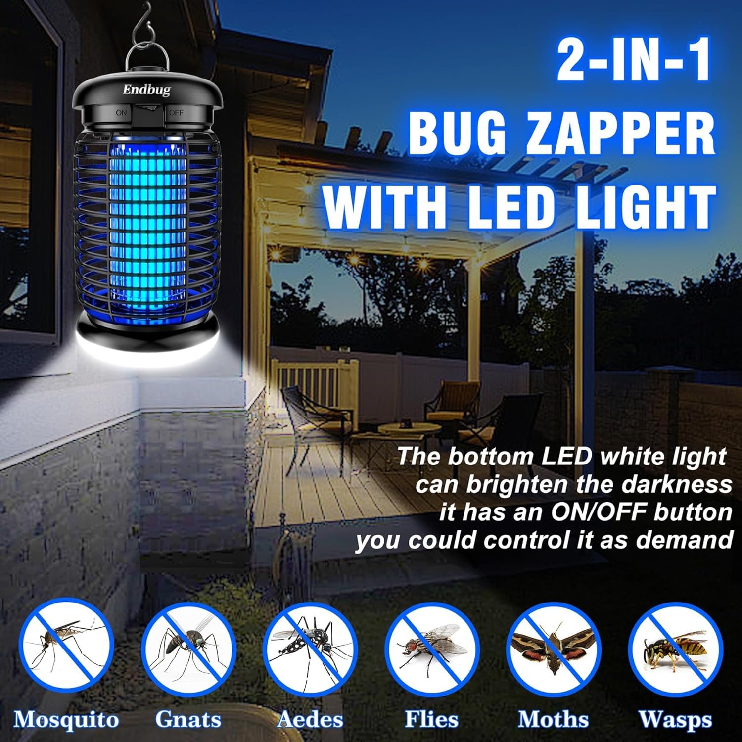 2-IN-1 OUTDOOR BUG ZAPPER: Designed with an LED white light on the bottom, Endbug mosquito zapper can not only effectively repels pesky insects but also illuminate the darkness at night, ideal for both indoor and outdoor use, especially perfect for outdoor activities such as dinners, party, BBQ, camping and more.