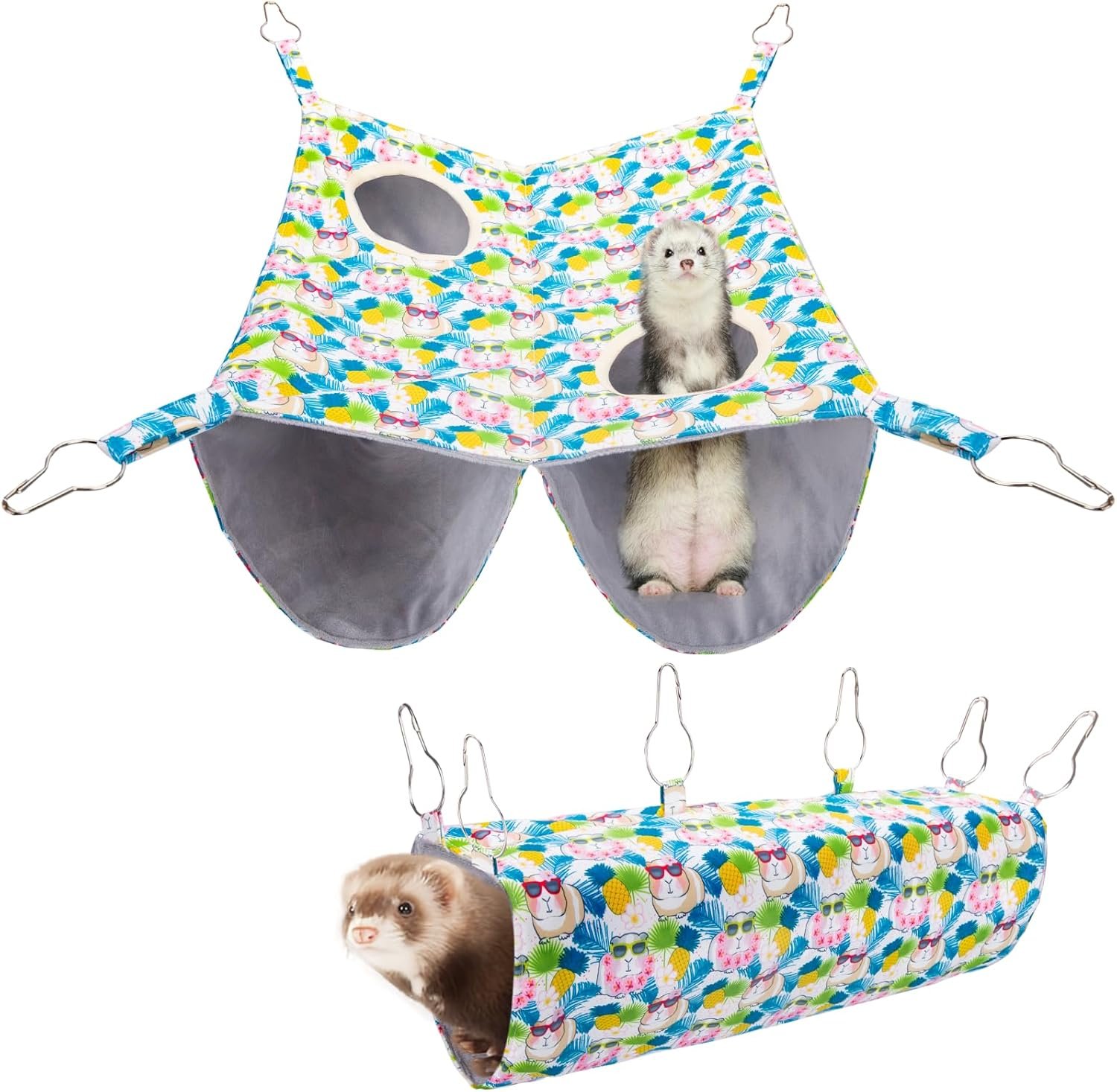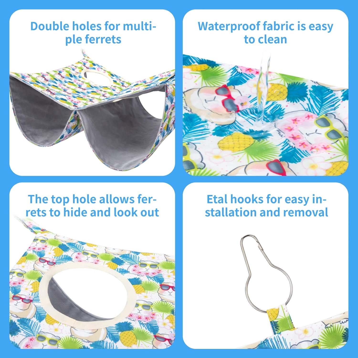 【UNIQUE DESIGN】This ferret toys features a 2-hole design and has 2 holes on the top to allow multiple ferrets to traverse up and down, adding fun and refusing to be bored.The hamster hammock comes with metal hanging clasps on the front and back, making it very easy to install.