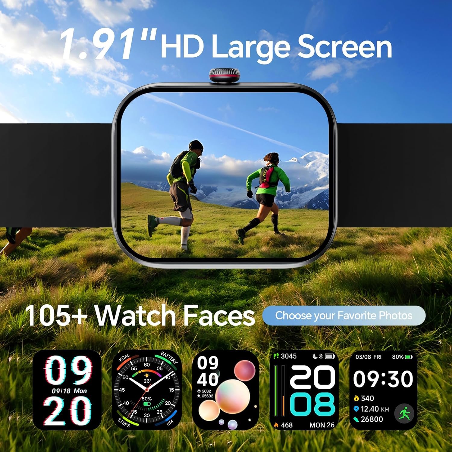 【1.91” HD Screen & 105+ Watch Faces】The smart watch for women men is equipped with a large 1.91 inch HD colorful screen, delivering exceptional picture quality and highly responsive touch sensitivity. The rotating crown on the side supports you to view and switch pages. The top button rotates the crown to easily switch one level of page, and long pages can be rotated and scrolled. Smart watch for iPhone compatible has 105+ dials to choose from, and you can also select your favorite photo as a dial in the watch.