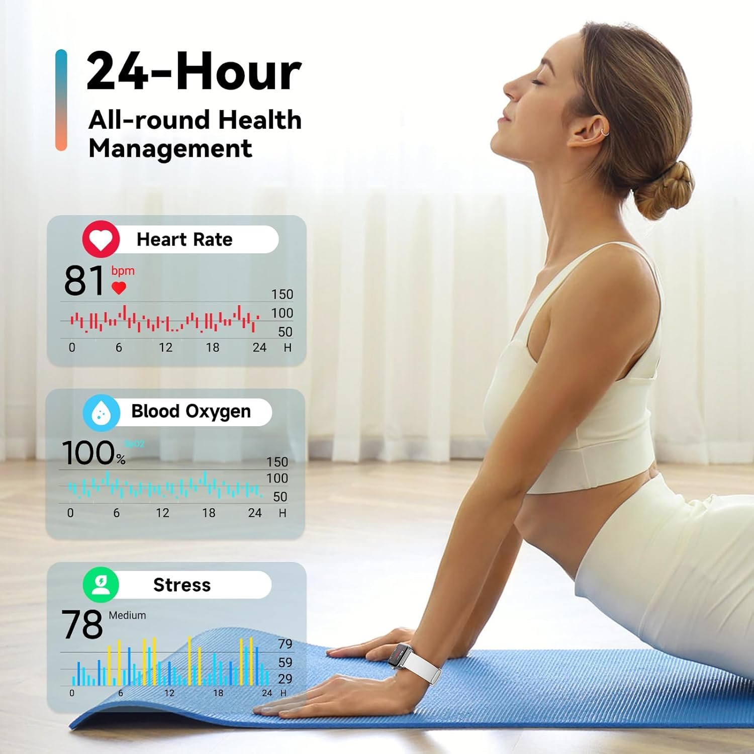 π24-Hour Health Automatically Tracker: Prioritize your well-being with sport watches for men women continuous health monitoring. Track your Heart Rate, Blood Oxygen levels, Stress levels, and Sleep patterns(Deep sleep, light sleep, REM analysis) around the clock.Take charge of your well-being and make informed decisions for a healthier lifestyle.