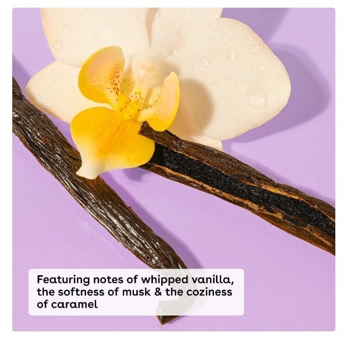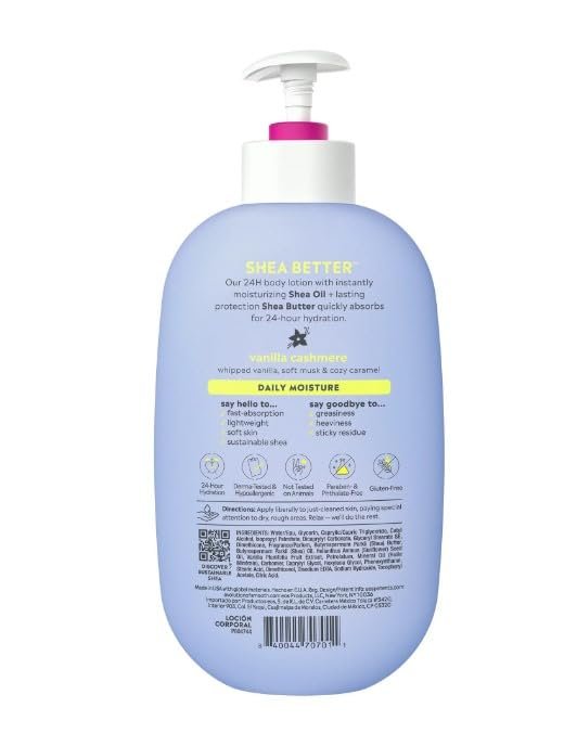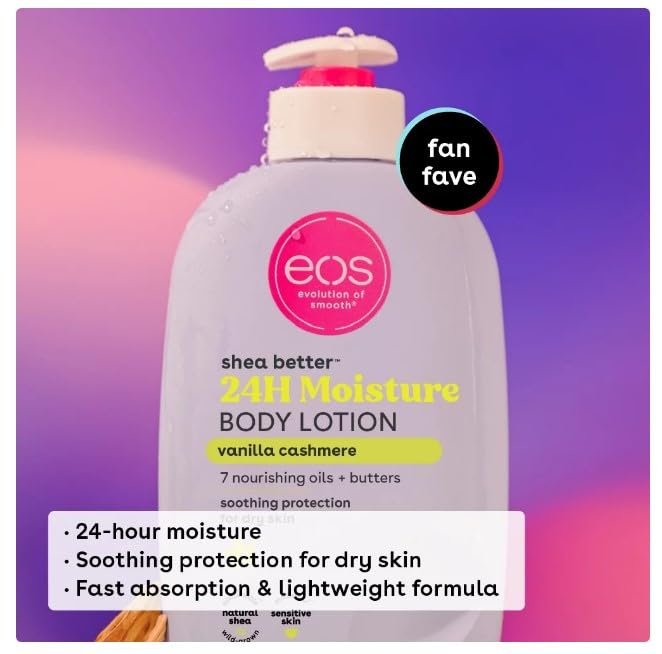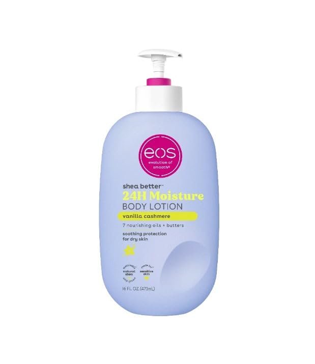 SHEA BETTER BODY LOTION: Our sweet and warm Vanilla Cashmere scent contains fragrance notes of whipped vanilla, soft musk and cozy caramel. eos 24-hour hydration body lotion is made with natural ingredients to leave your skin smooth from head-to-toe