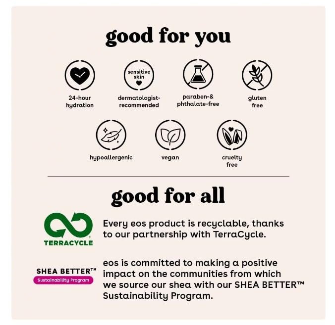 ALL-NATURAL SHEA BUTTER: eos products have wild grown, sustainably-sourced 100% natural shea butter to make skin feel moisturized, protected and soft. We are paraben, phthalate and gluten free. Dermatologist tested. Vegan. Hypoallergenic. PETA certified. No products tested on animals