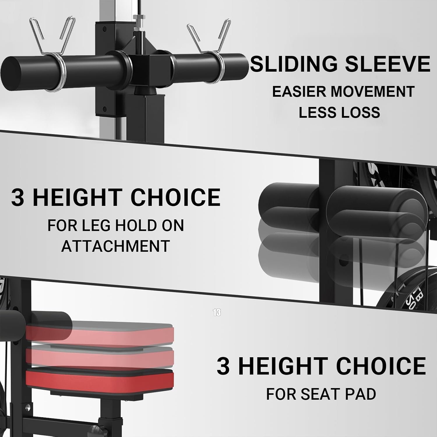 【Lat/ Low Row System】Enhanced versatility: Enjoy a full-body workout with ease using our premium power cage, featuring an integrated Lat Pulldown System and Low Row System. The 4 rolling bearings of the weight holder bring a smoother pull-down workout experience and decrease the noise during training. The Special Detachable Sleeve can fit both 1”/2” weight plates.