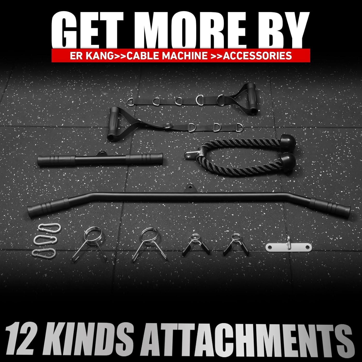 【DESIGNED FOR HOME GYM】Big footboard on the Base-perfect attachment for the seated cable row. Upward 10° of Weight peg can prevent weight plates slip off. It also comes with detachable sleeves to fit 1”/2” plates. Special four buckles strap handles can let you easily adjust the length you want. Also, this machine comes with 3 additional attachments: Lat bar, Cable bar, and Tricep rope.